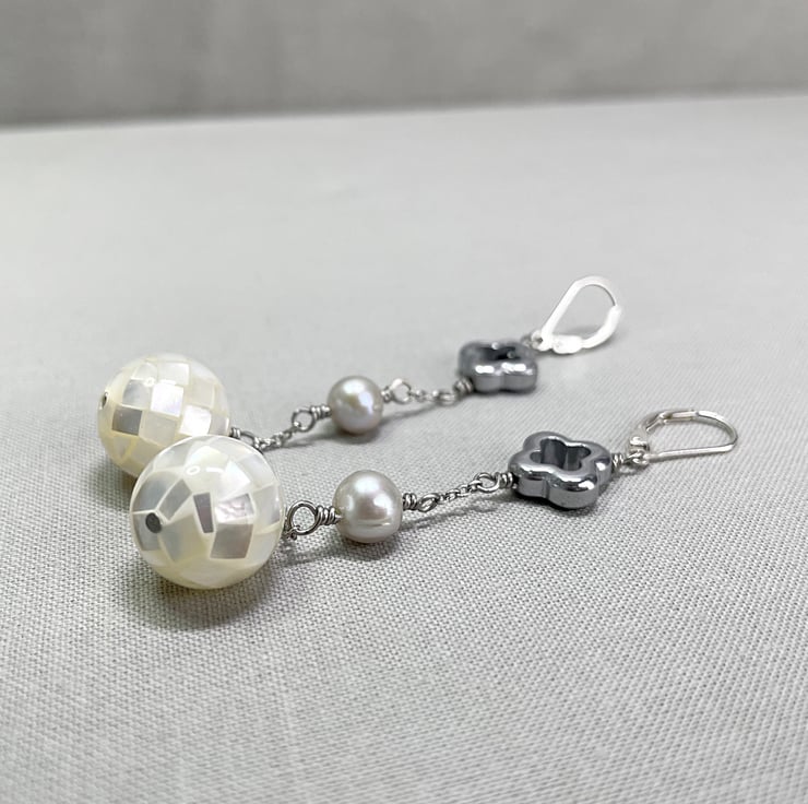 A very elegant pair of long drop earrings featuring silver coloured cultured Pearl, Hematite and mosaic shell Pearl. Ideal for bridal or a special occasion. Perfect for an October birthday gift.