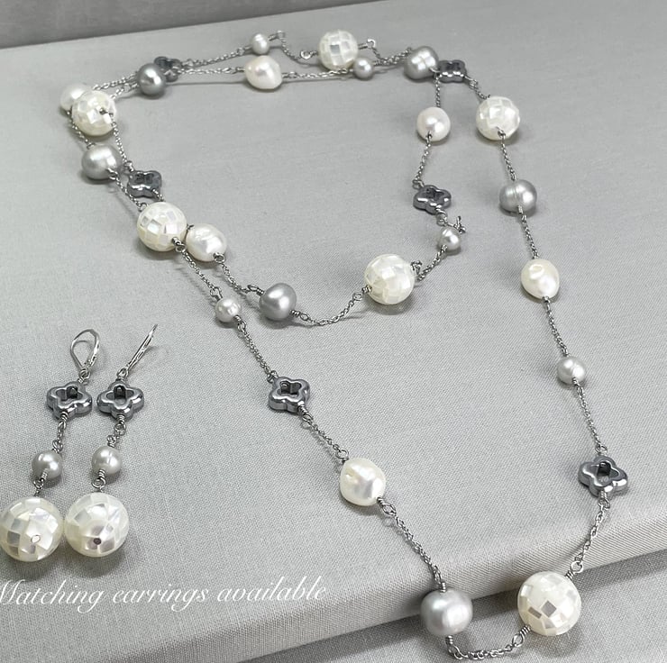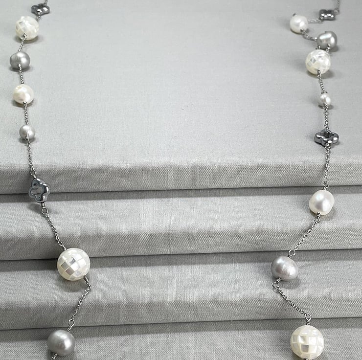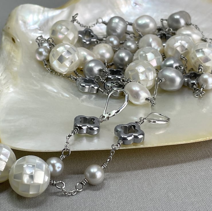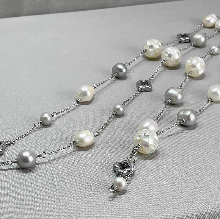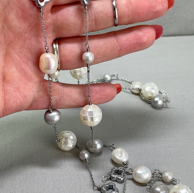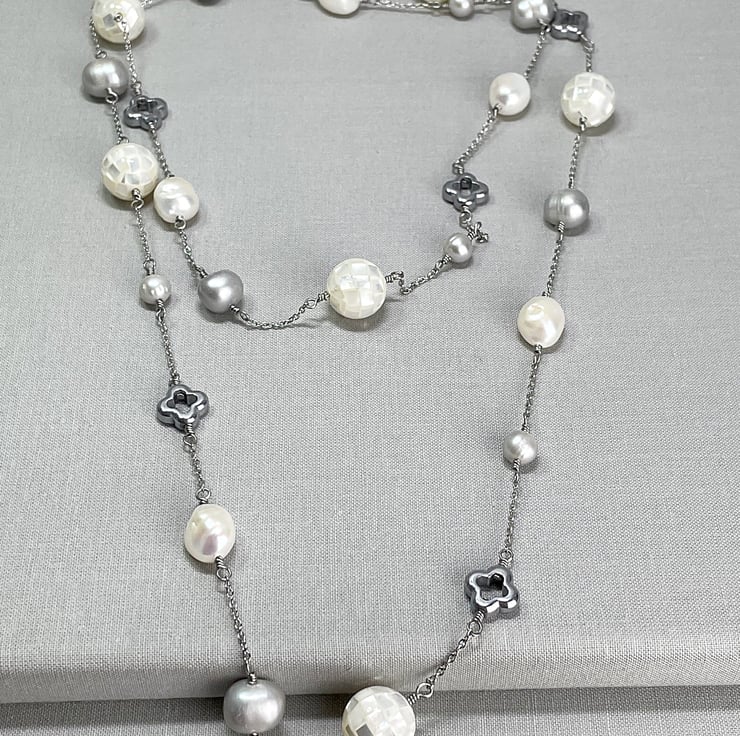 A stunning long rope style necklace features silver clover shaped Hematite, silver and white cultured Pearls and white mosaic shell Pearl rounds. The whopping 44 inch necklace can be worn as a single strand or wrap it round your neck twice to make a double strand.