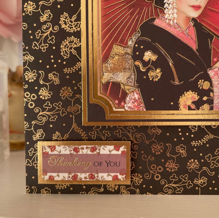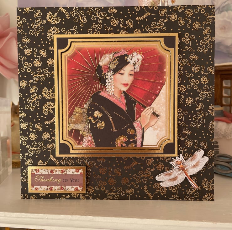 6" x 6" white card and envelope with a black and gold print background. An elegant Geisha and umbrella with a dragonfly to one corner.