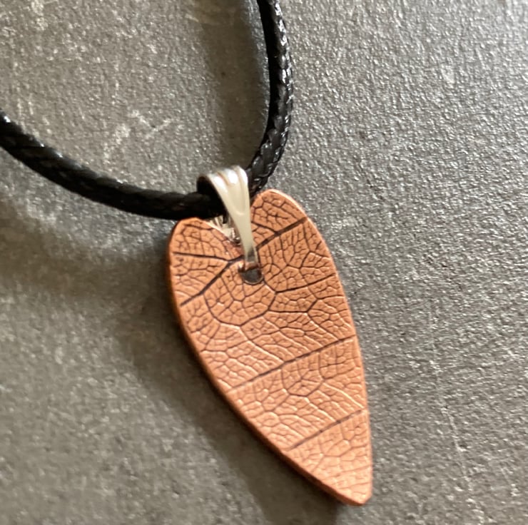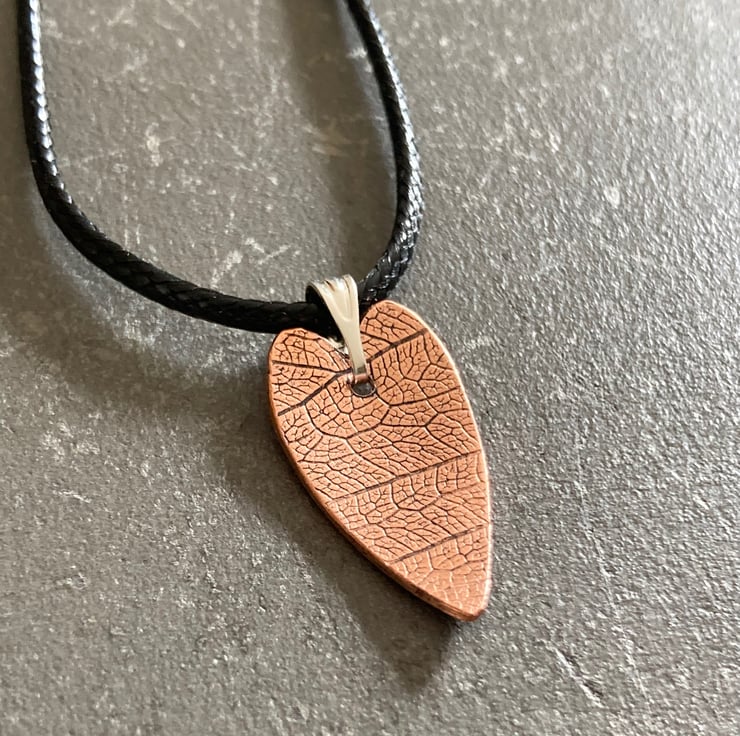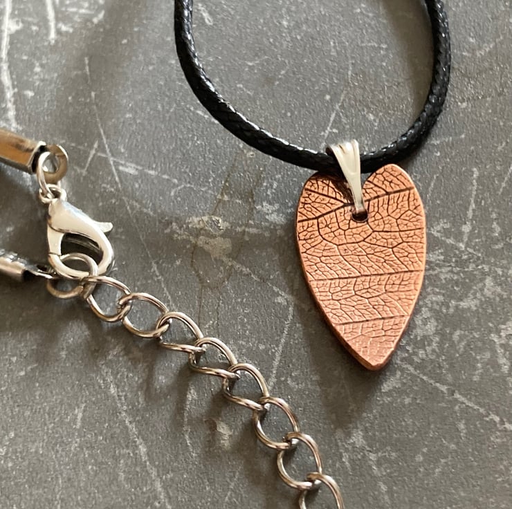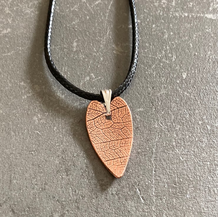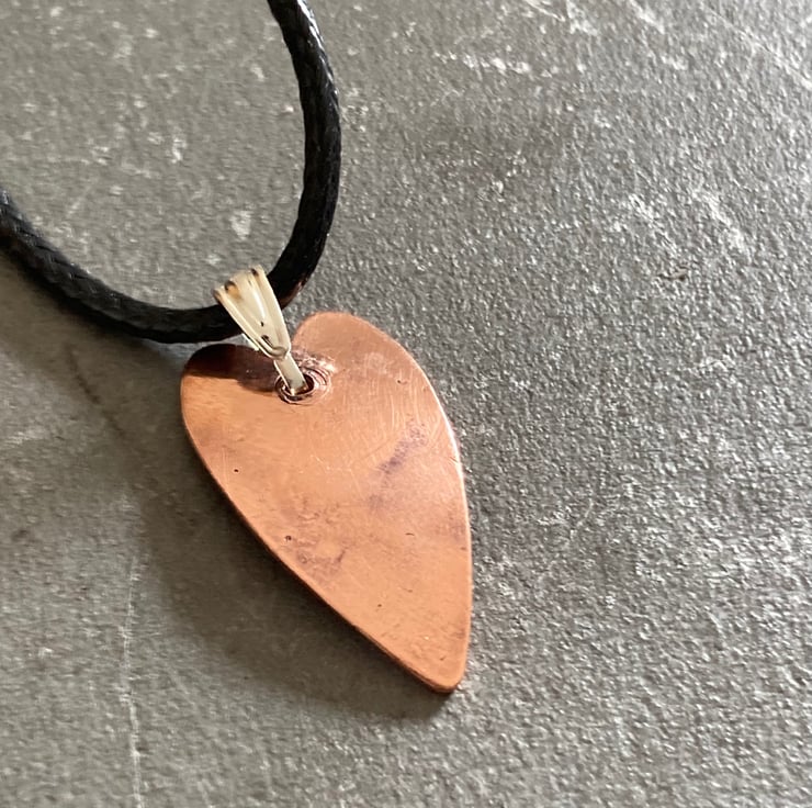 Reclaimed copper, roll-textured with a leaf and hand pierced into a heart shape and suspended from a black waxed cotton cord. Each one is hand made, so the exact texture will vary. These pendants are sold to raise money for my mighty hike in the Wye Valley, in aid of Macmillan in September 2021