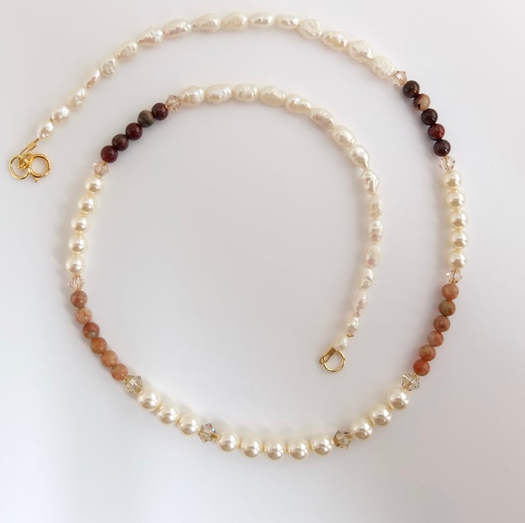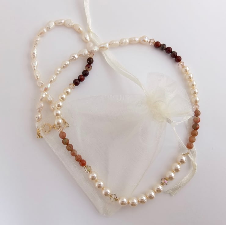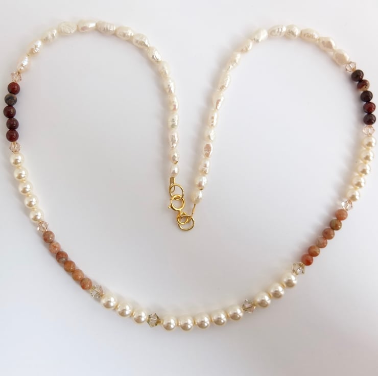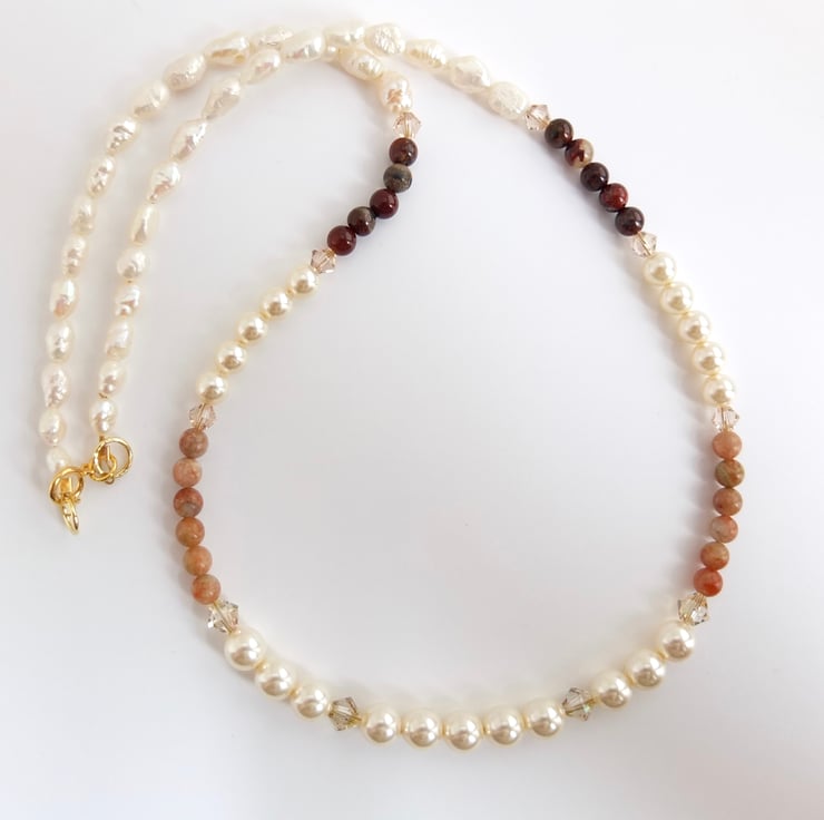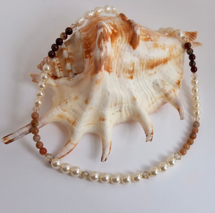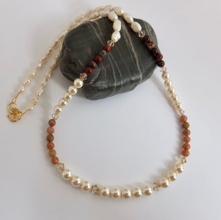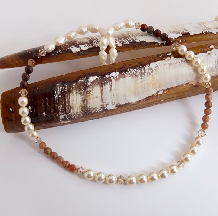 Elegant strand of 6mm and 4mm Swarovski pale cream glass pearls and 4mm lace and red agate beads interspersed with sparkling Swarovski crystals in colours called "luminous green" and "silk".