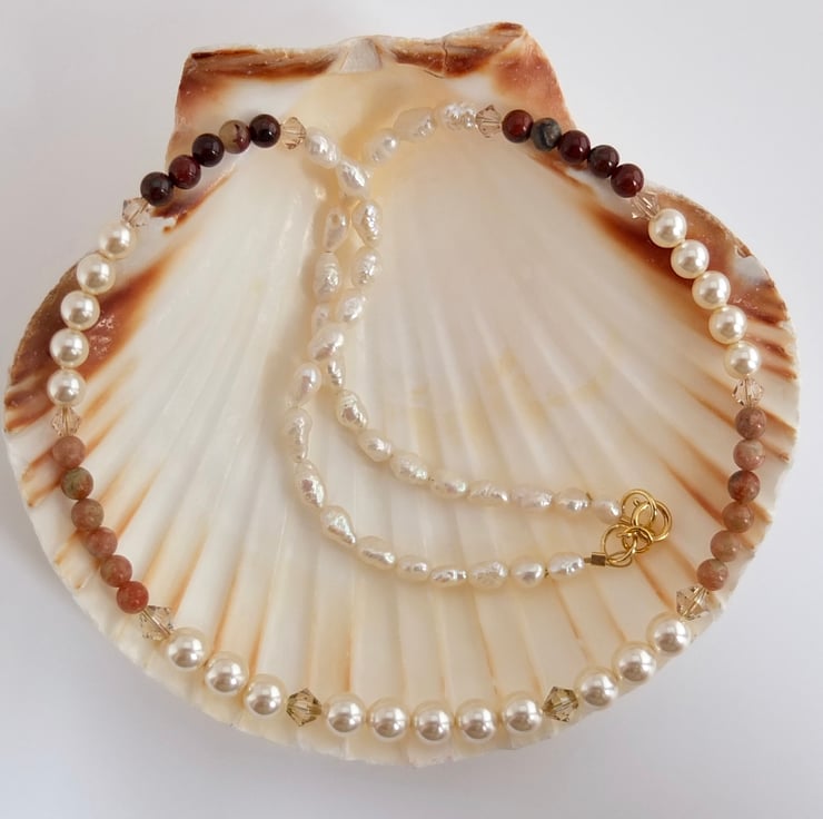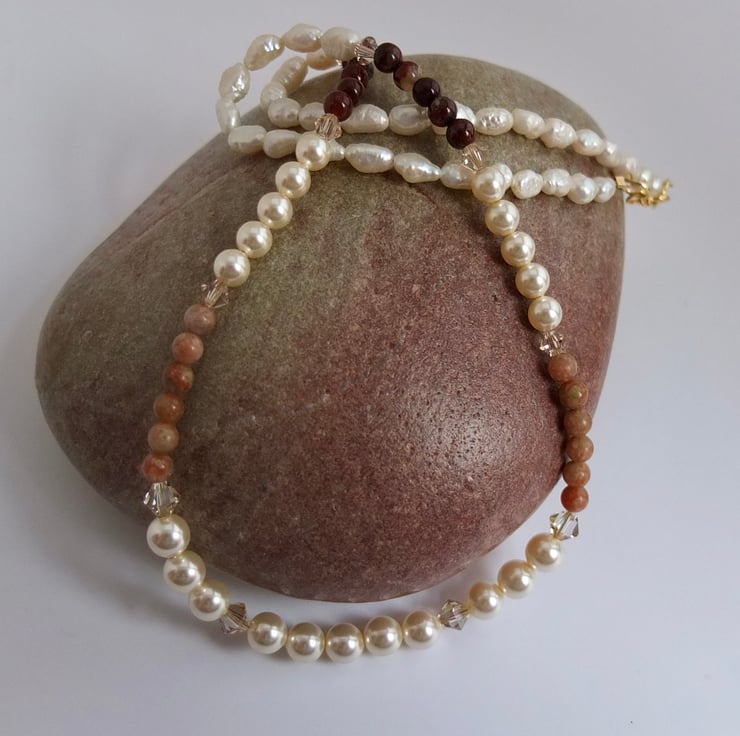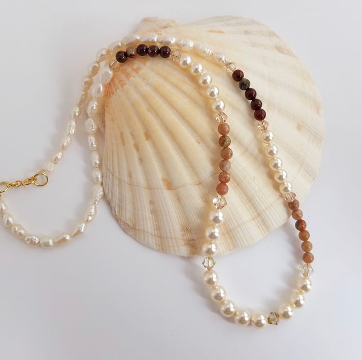 The pearls, both glass and freshwater, have a soft, rich sheen.