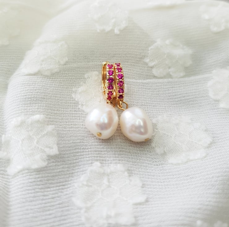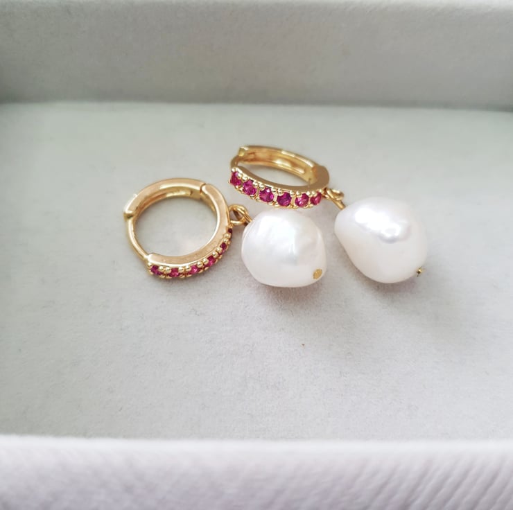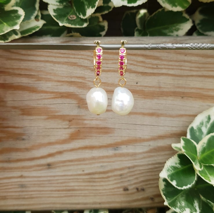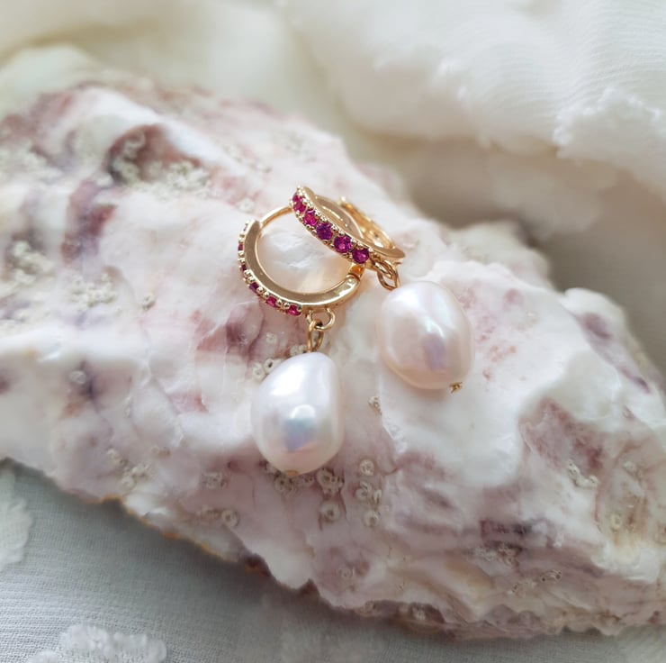 These stunning, on trend earrings feature a genuine natural freshwater pearl paired with an 18K gold plated hoop encrusted with fuchsia pink pave detailing. The pearls shimmer as they catch the light and are truly stunning. The earring is a round leverback making it very secure, leightweight and comfortable to wear.