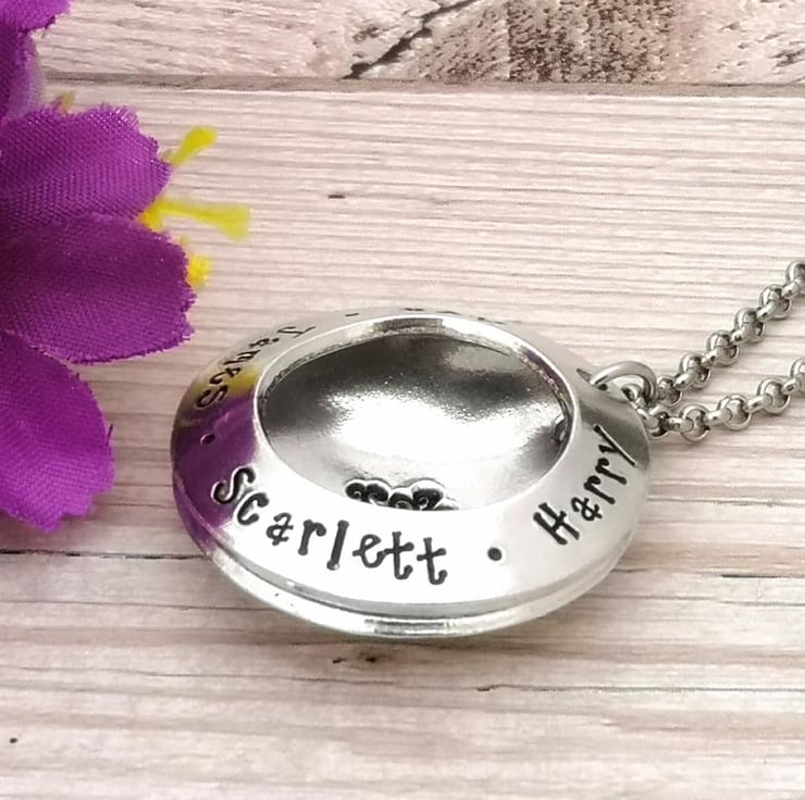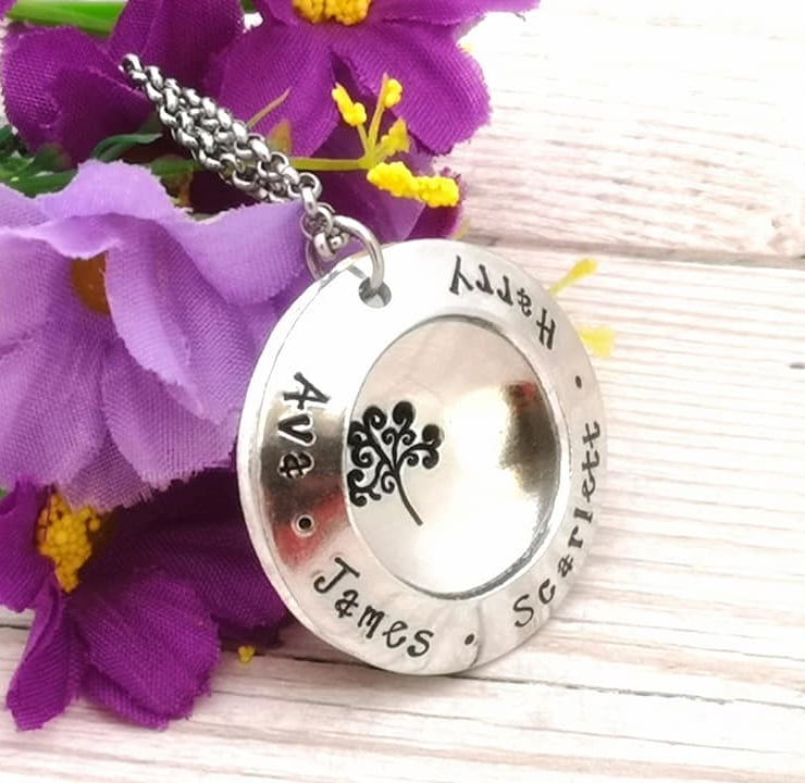 Up to 25 characters (including spaces and the . in between names) can be used on the outside washer of this pendant. The inside disc will have a tree stamped on it.