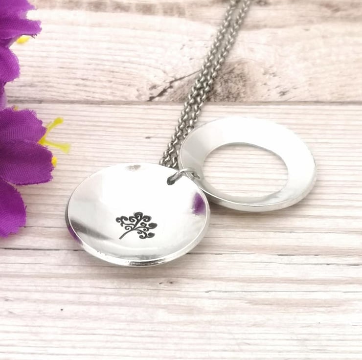 This aluminium metal necklace will be made to order by hand stamping each individual letter and tree onto blank aluminium shapes. They are then domed, polished and finished by painting each letter with black ink.