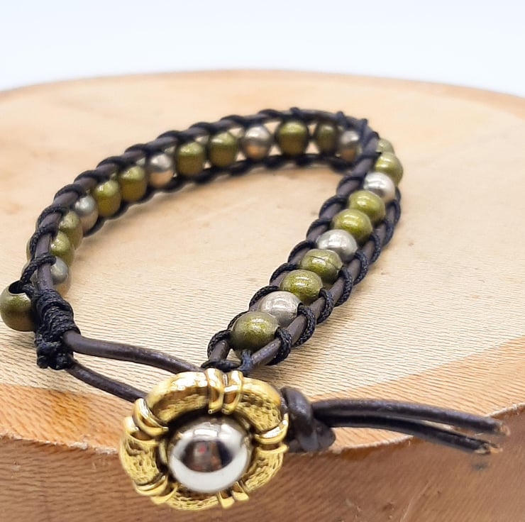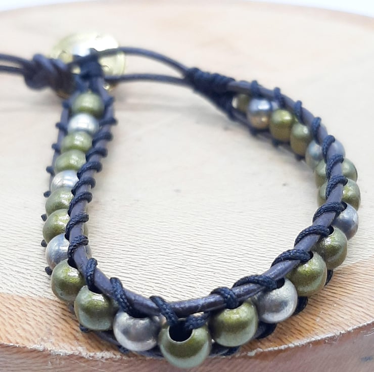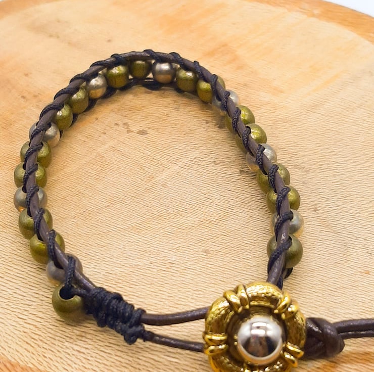 Here is a handcrafted ladder weave bracelet, woven onto leather and it closes with a gold and silver coloured button and leather clasp. Great for casual wear