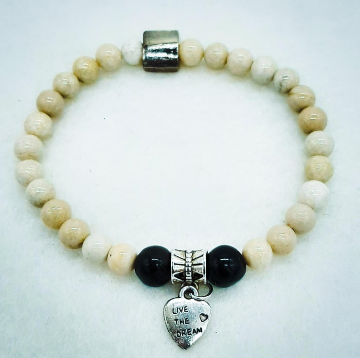 It's made with genuine 6 mm Riverstone gemstone beads and 8mm Blue Goldstone beads. It's adorned with a tiny silver coloured charm that says "Live the Dream".