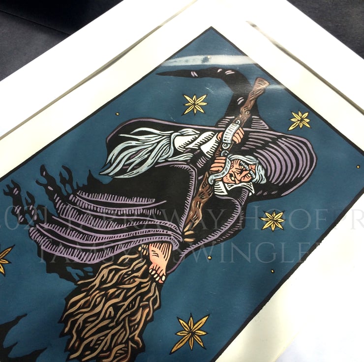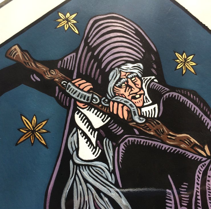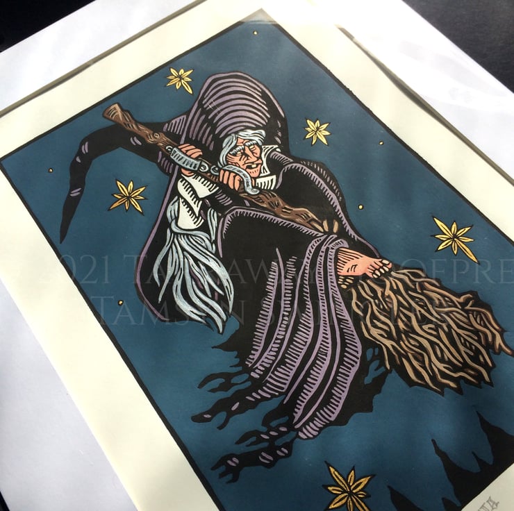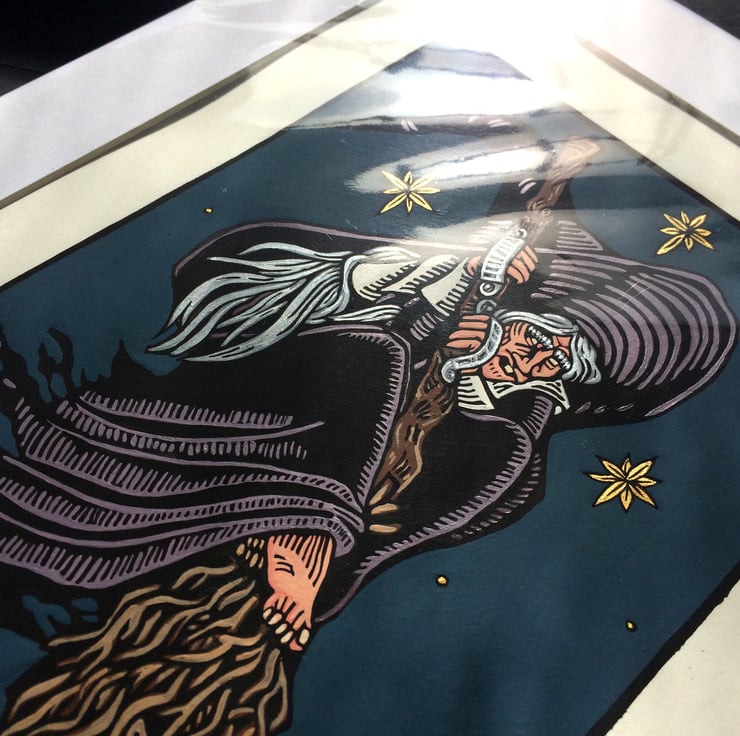 Water-based black, matte ink print on white 250 gsm paper, hand-hand pressed with a spoon and touched up by hand also to give it a consistent tone all over. Hand painted in a mix of acrylic pains, ink, with metallic acrylic paint details on the stars and hair.