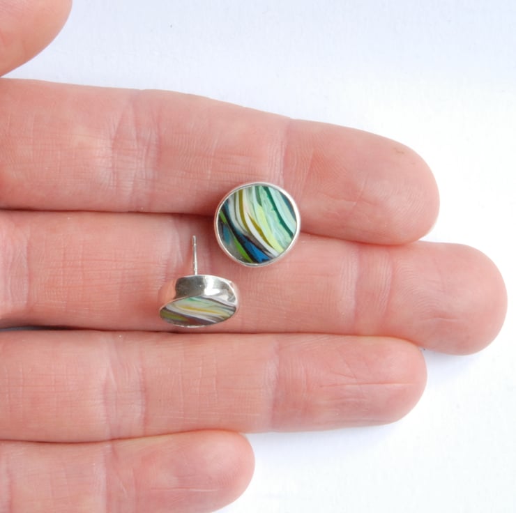 These stud earrings have been made by bezel setting discs Cornish surfite in sterling silver and finishing them off with silver posts and scrolls. The surfite is has a swirly pattern in shades of mint, teal, yellow and white, some of the colours are translucent so light shines through it and reflects of the back of the setting. These studs measure almost 13mm across (one is slightly smaller than the other but it won't be noticeable when they are being worn), they are about 4mm thick excluding the length of the posts. Surfite is lightweight so they won't be heavy in your lobes. Comes gift boxed.