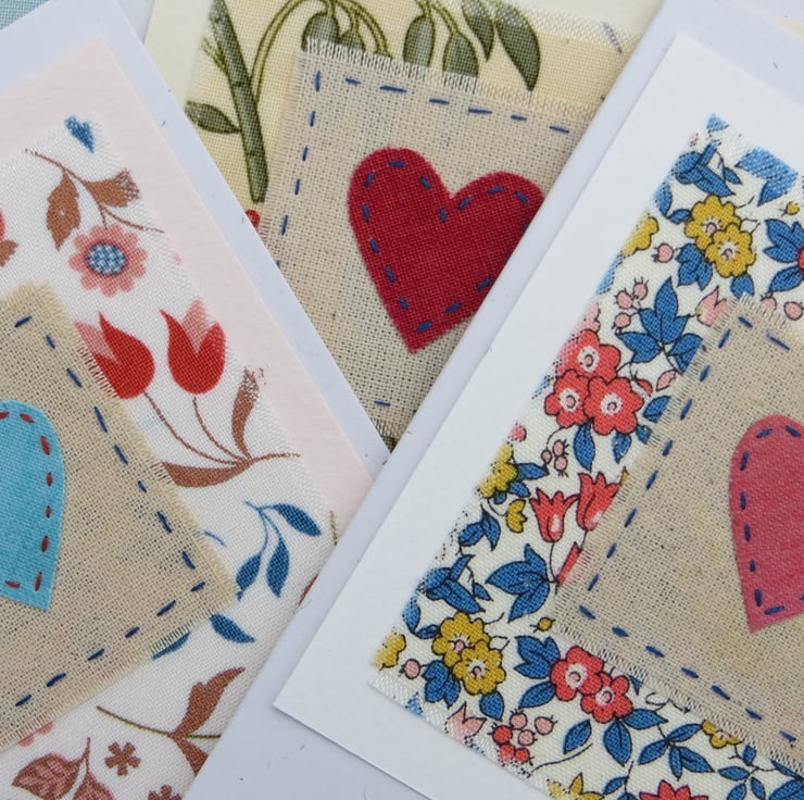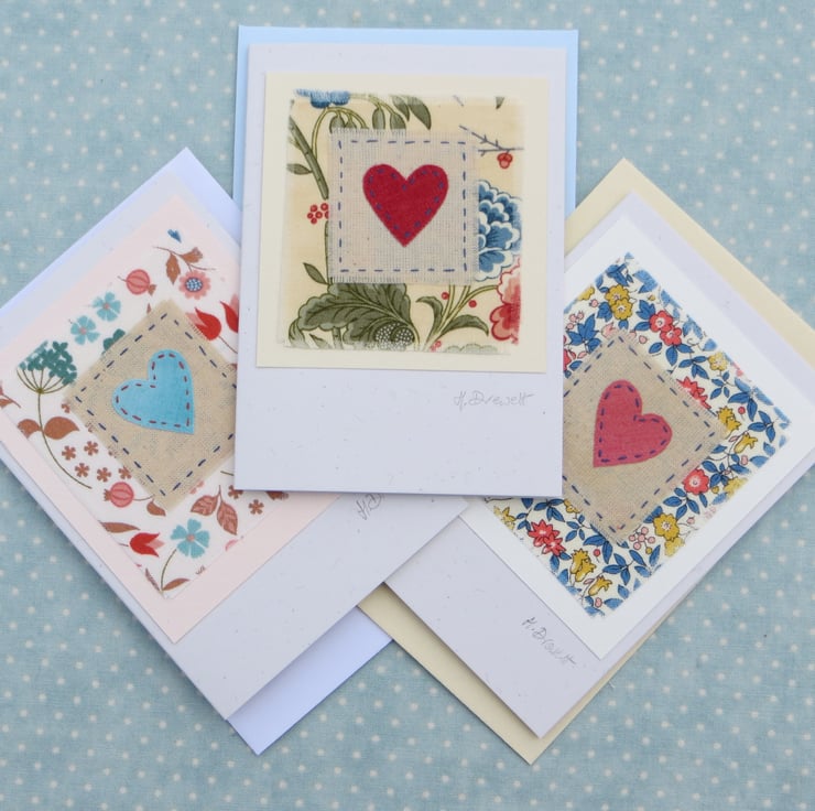 Three hand-stitched cards: hand dyed heart applique with pretty cotton print background.