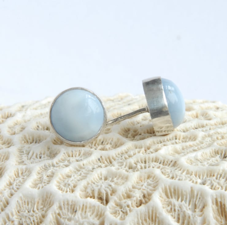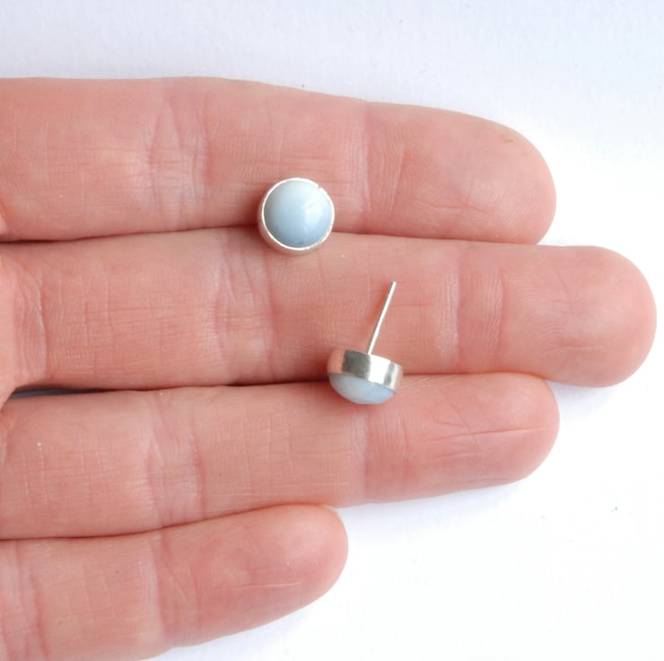 These easy wearing everyday stud earrings feature round cabochons of blue opal which has been bezel set in sterling silver and finished off with sterling silver posts and scrolls. The blue opal is mottled with shades of sky blue through to chalky pale blue that's almost white, they have a glossy shine to them but don't exhibit any fire. They measure 9mm approx across and about 5mm high and come in a gift box (the prefect present for someone with a birthday in October as Opal is their birthstone).