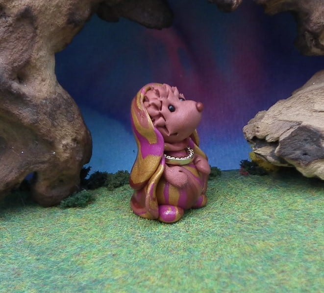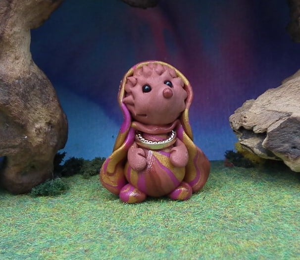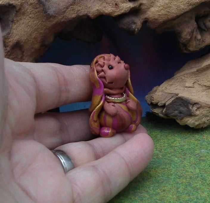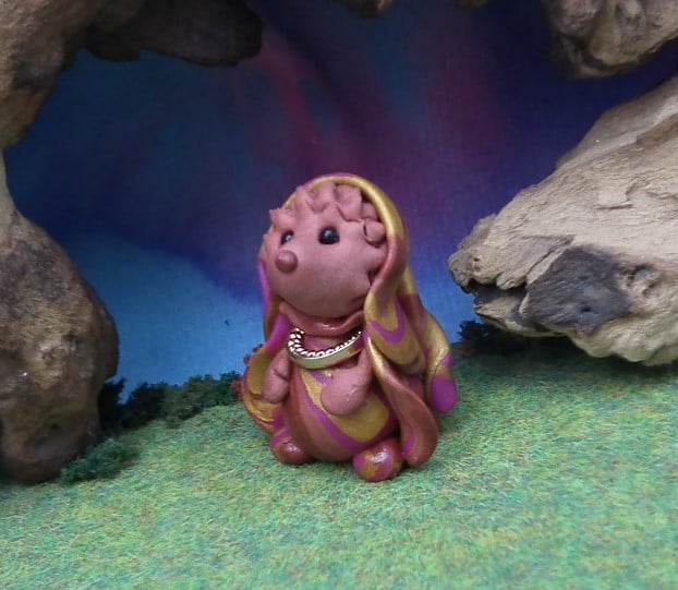 This is a 'one of a kind' creation; entirely handmade without the use of moulds here at my studio on the Sussex Coast. Modelled with Prosculpt polymers, painted with heat set paints before sealing with lacquer, Rosehip has sparkling black onyx eyes and is one and a half inches tall.