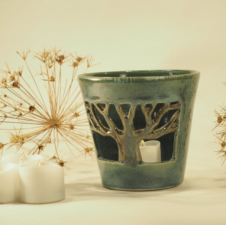 This candle holder has been thrown on the wheel and a tree of life design carved into it by hand when it is at the leather hard stage. Each tree is different and this one is like an oak tree. Finished in a grey-green shiny glaze, with the tree highlighted using iron oxide.