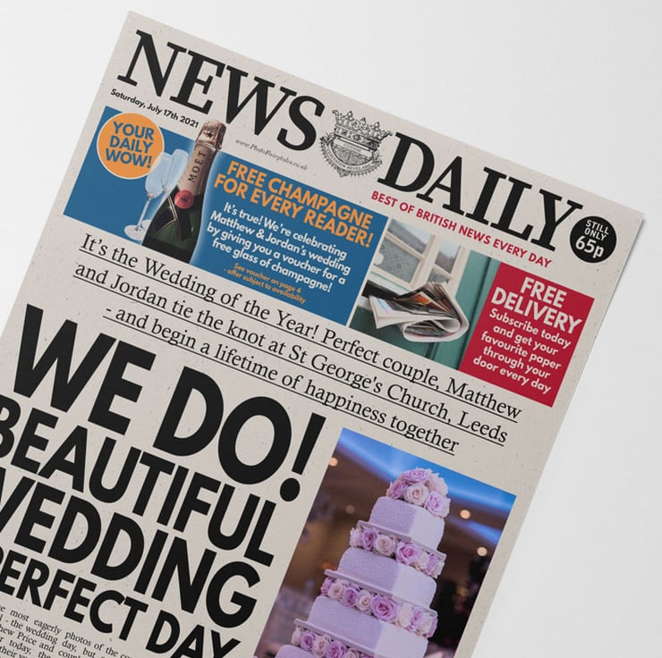 Hit the headlines on your wedding day with your very own Personalised Wedding spoof newspaper! The perfect gift for the happy couple, this fun print is created to order and is a lovely wedding keepsake. Your details will be merged throughout the article and headline, and you can even choose to add your own photo too. Printed onto lovely off-white recycled paper and a generous A3 size, this gorgeous looking newspaper print make a truly unique wedding gift idea for the happy couple or yourselves.