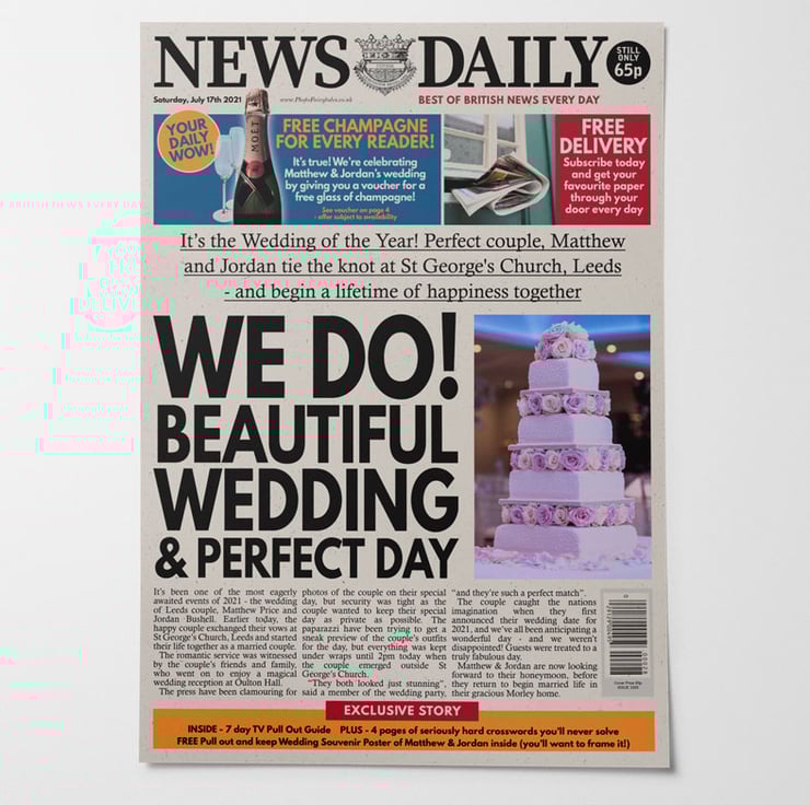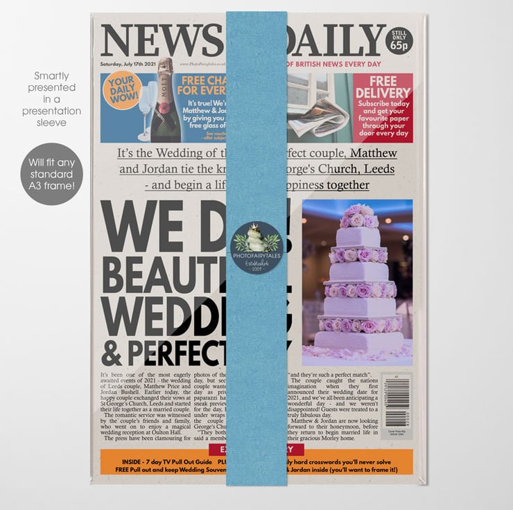 Hit the headlines on your wedding day with your very own Personalised Wedding spoof newspaper! The perfect gift for the happy couple, this fun print is created to order and is a lovely wedding keepsake. Your details will be merged throughout the article and headline, and you can even choose to add your own photo too. Printed onto lovely off-white recycled paper and a generous A3 size, this gorgeous looking newspaper print make a truly unique wedding gift idea for the happy couple or yourselves.