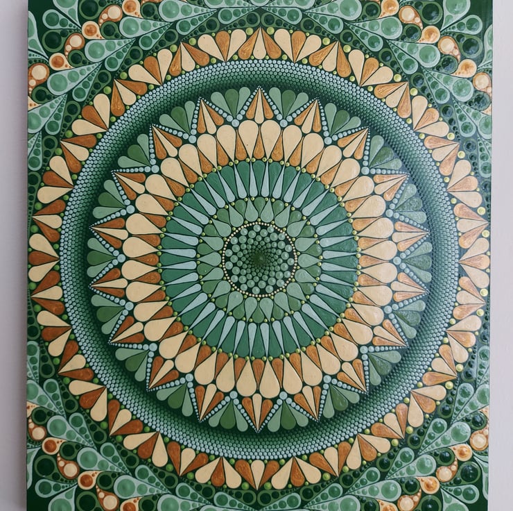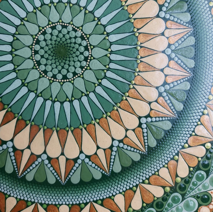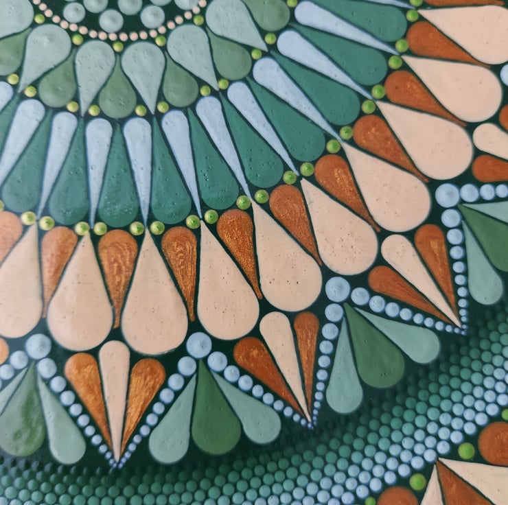 Hand painted in a mix of matt, gloss and metallic acrylic paints using dotting tools and scribing tools for precision.