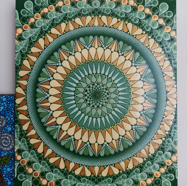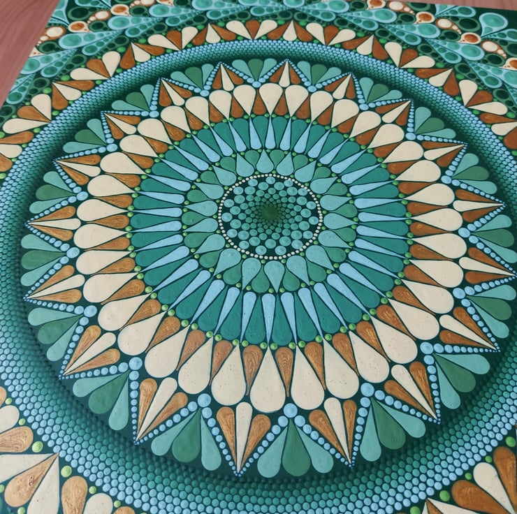 I don't plan my pieces, other than the colour scheme, before I start, I simply draw a grid to guide the pattern so it stays even and symmetrical and then just begin. As each circle is completed I then figure out how the next one will fit. I am always eager to find out how the piece will turn out!