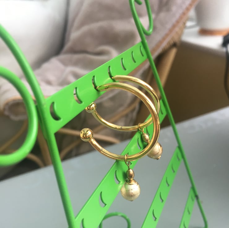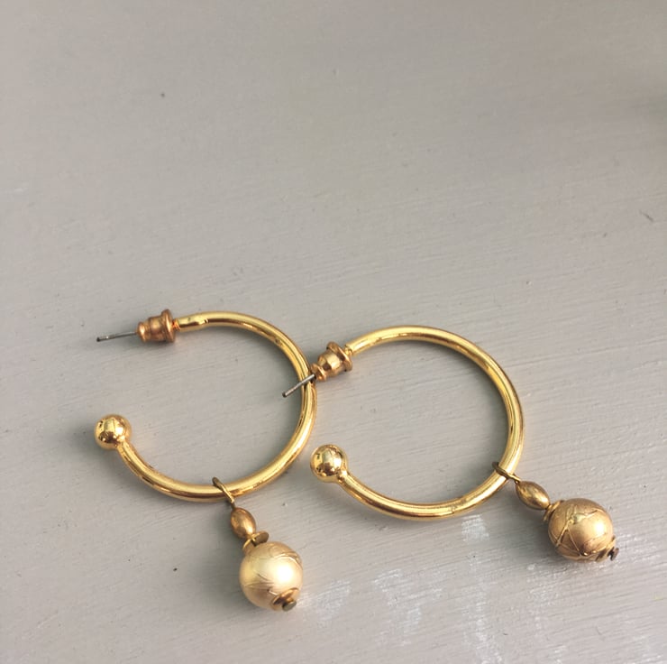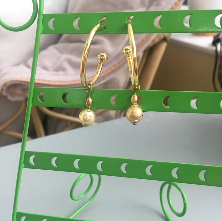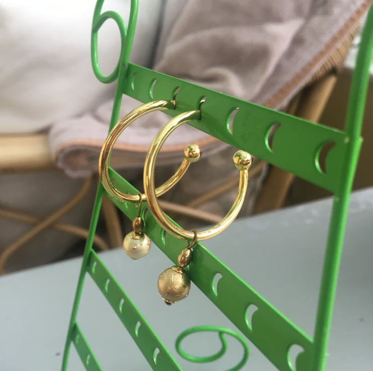 A plain pair of gold tone hoop earrings with pin fitting. Each hoop has a ball fixed to the end and a free moving brushed gold tone bead dangling from it. This moves around the hoop freely. A safety back is supplied. The drop, including the bead is about 4.5cm.