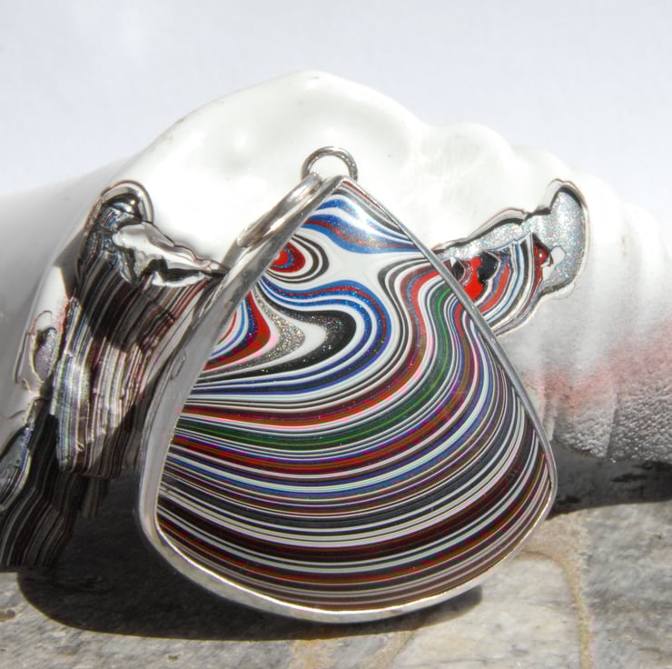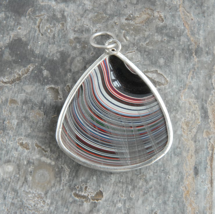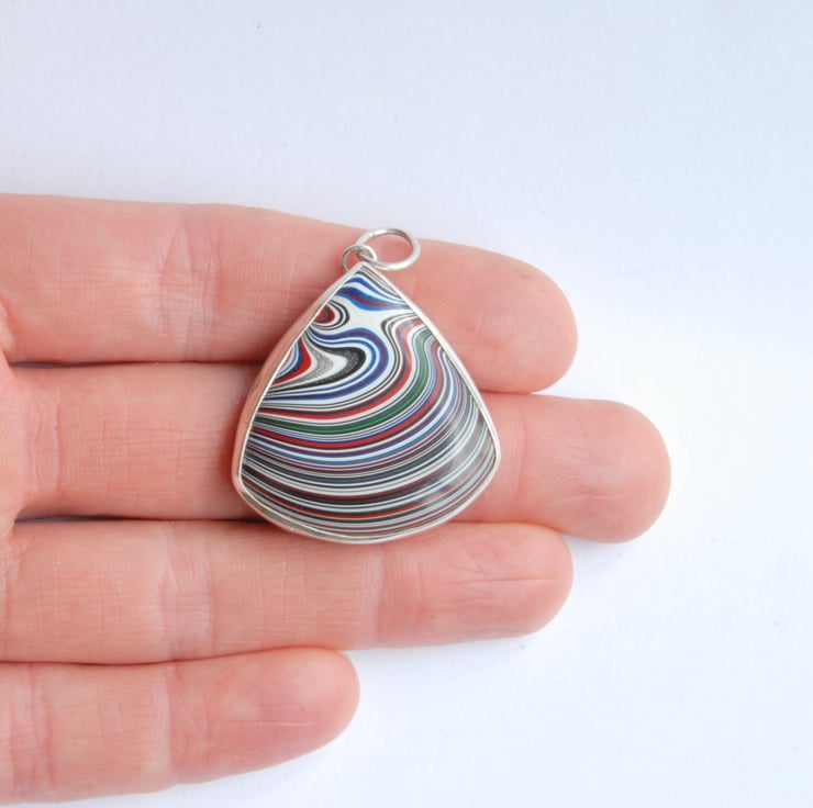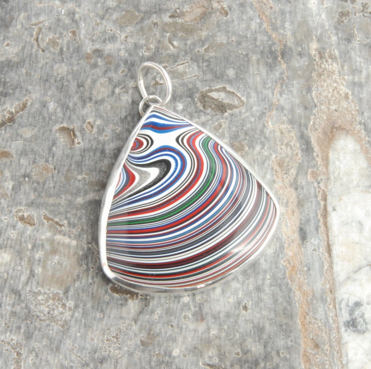 This unisex pendant features a rounded triangular piece of fordite which has been smoothly bezel set in sterling silver (its a strangely satisfying shape to hold). The front of the pendant has sweeping lines in shades of red, white and blue with a little green and sparkly grey. The pendant has an open back setting meaning it could be worn either way round but the back shows the hard life the fordite had when it was smashed off the spray booth (there is a photo of the back). The shape and colour palette are unisex so it could be worn by anyone who likes the unusual (or trucks). Measures 41mm top to bottom (inc generous bail) and 32mm wide. Comes with an 18 in silver chain in a gift box (you could easily put it on a different chain or thong).