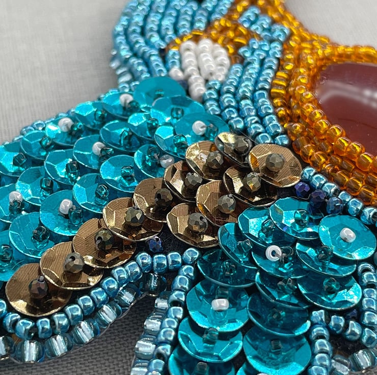 He features a red/orange Onyx cabochon for his belly, his wings have been sequinned to the max because he's just fabulous! Who doesn't love sequins right? His beak is encrusted with micro faceted black Spinel including his eye too. Below his wings is a whole strand of micro faceted Neon Apatite so he will sparkle all over when he flies! (Not really obviously)!