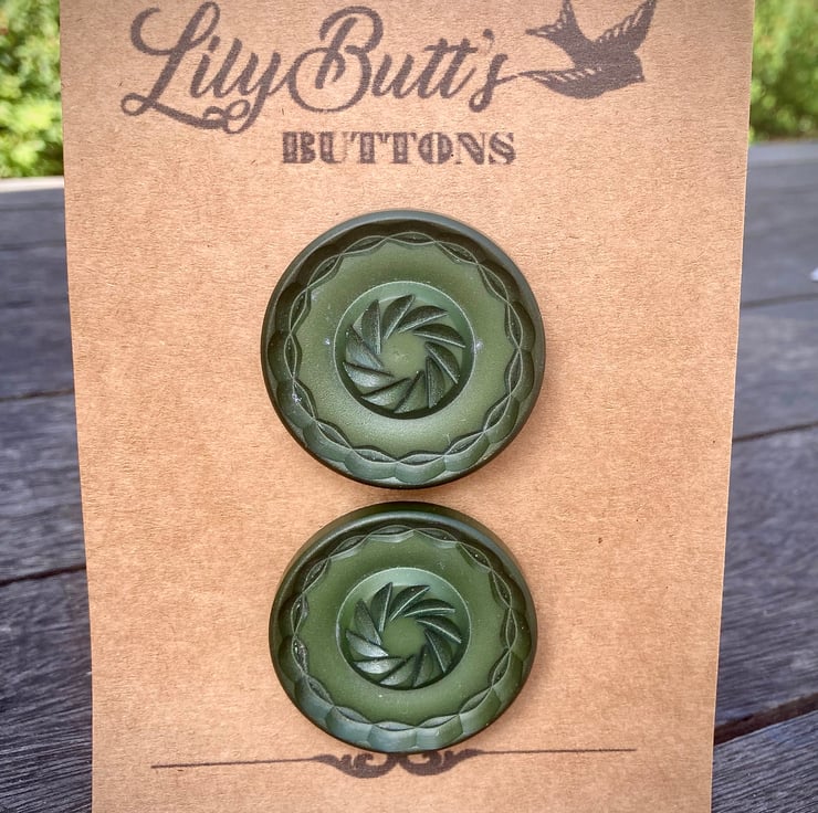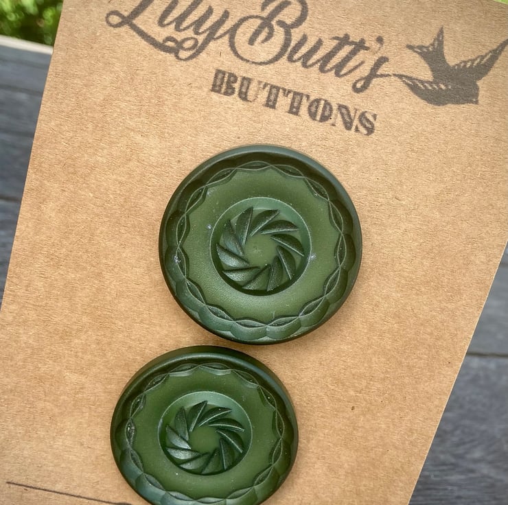 2 Vintage Dark Green Buttons, these are kinda Olivey Dark Green, lovely 'carved' pattern, would look great on a jacket or even a chunky cardi!