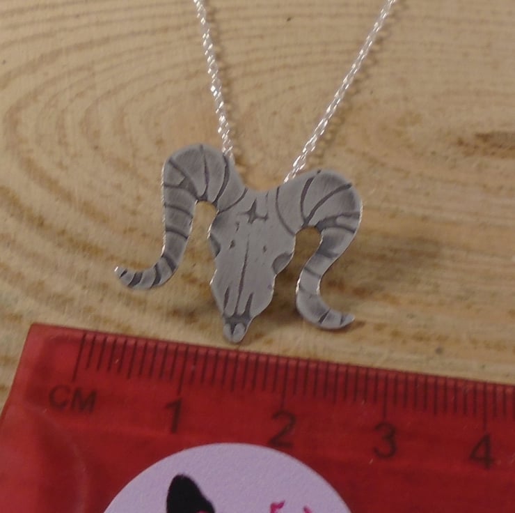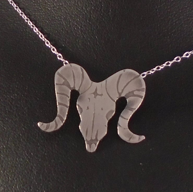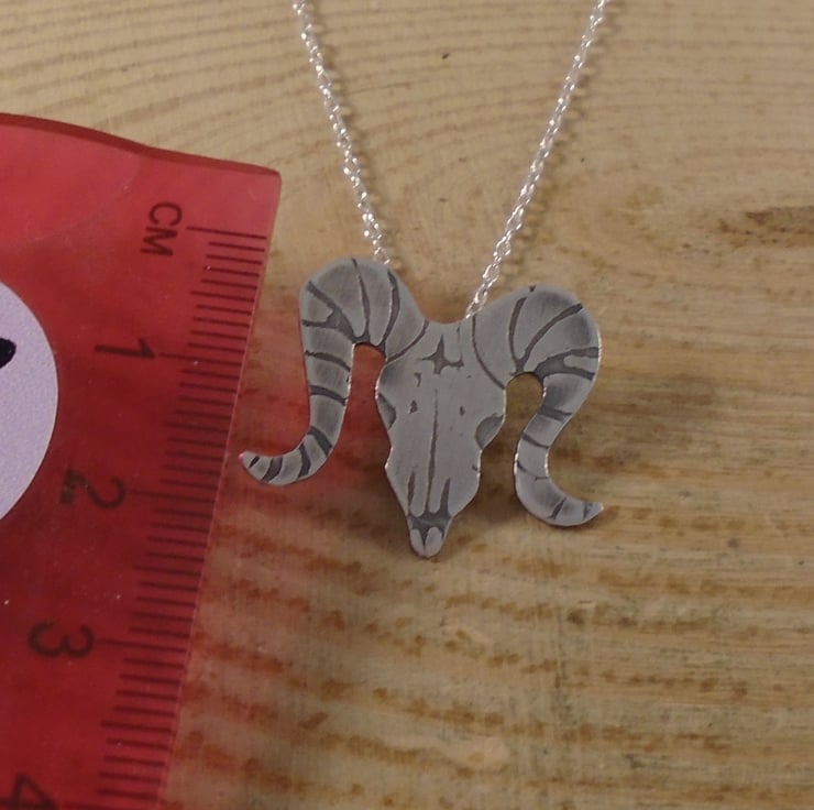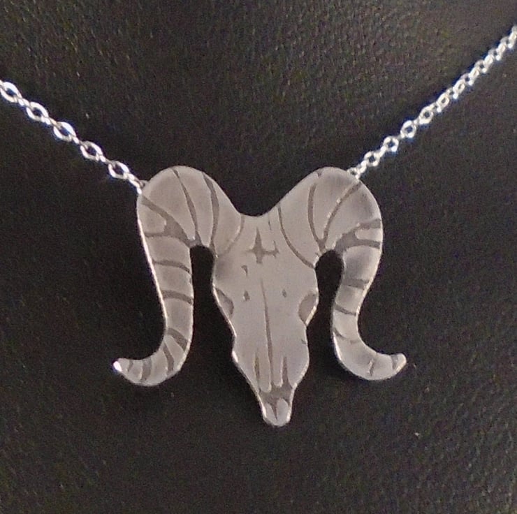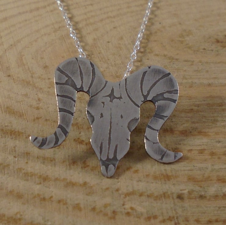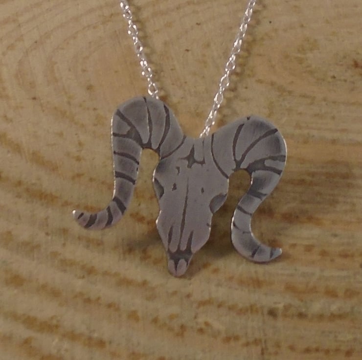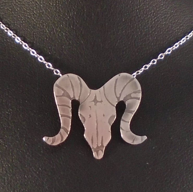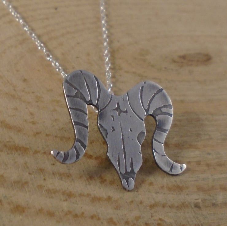 A quirky, gothic themed necklace, hand made from sterling silver. The shape of the ram skull has been hand pierced from a sheet of sterling silver. The details have then been hand drawn and etched. A loop has then been soldered to the back for the chain, and then the necklace has been oxidised to blacken the etched details.