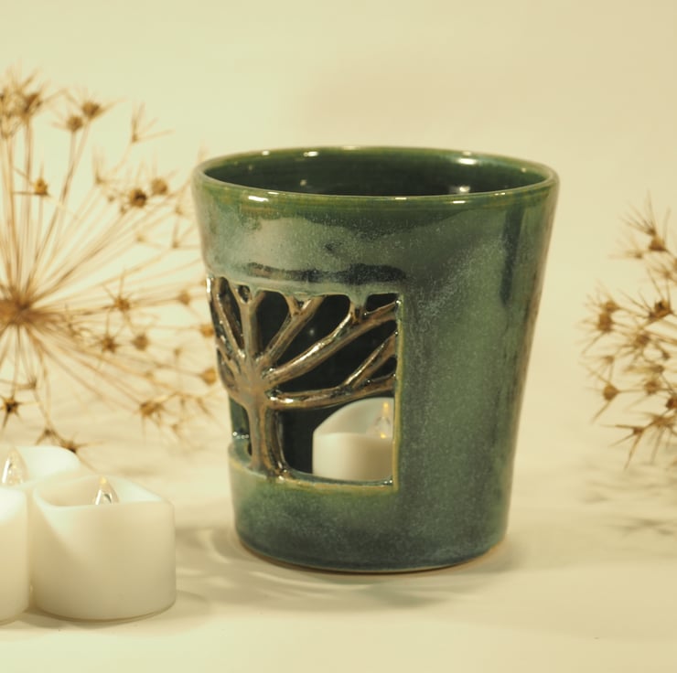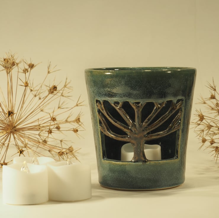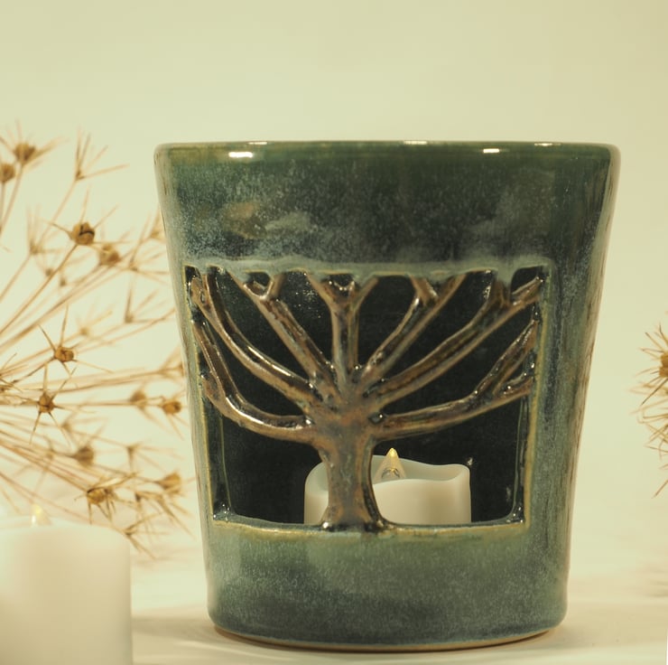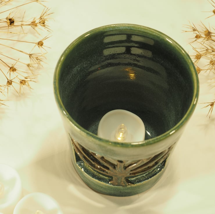 This candle holder has been thrown on the wheel and a tree of life design carved into it by hand when it is at the leather hard stage. Each tree is different and this one has seven branches. Finished in a grey-green shiny glaze, with the tree highlighted using iron oxide.