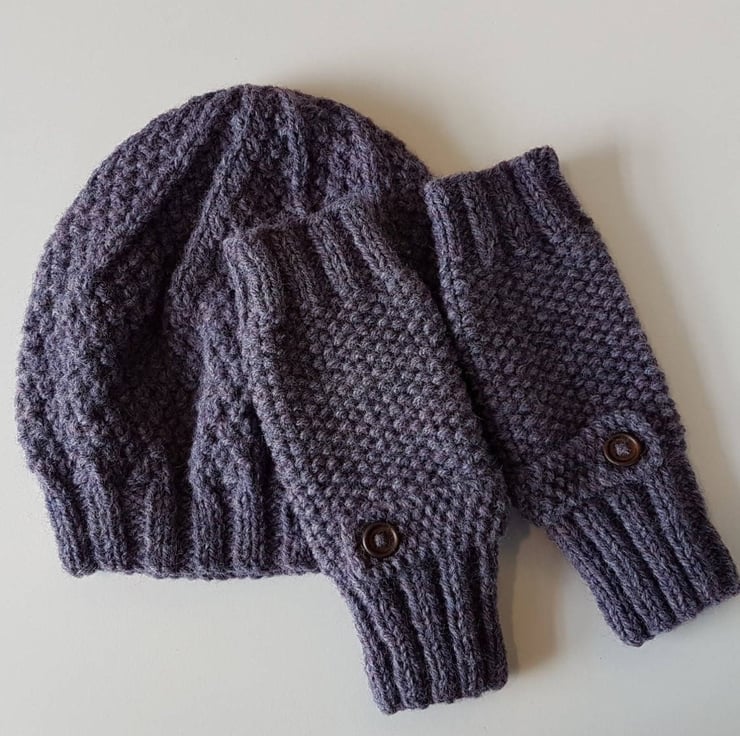 Nice and warm for the Autumn and Winter, this ladies grey beanie hat is hand knitted in a lovely and soft 25% pure Aran wool and 75% Acrylic yarn with a ribbed and double moss stitch pattern.