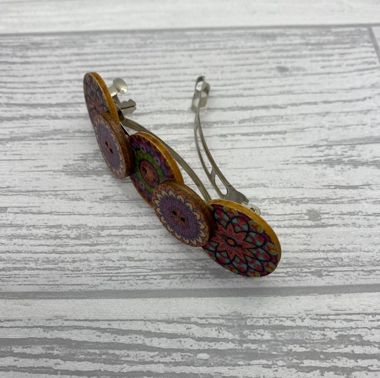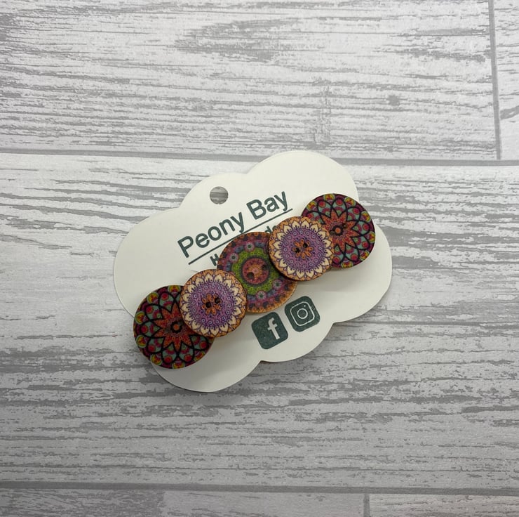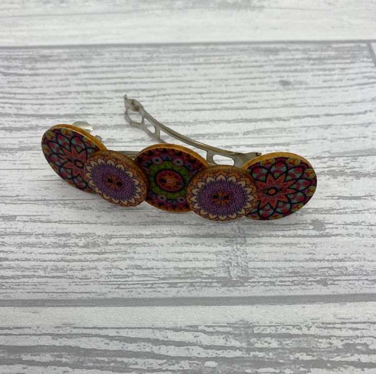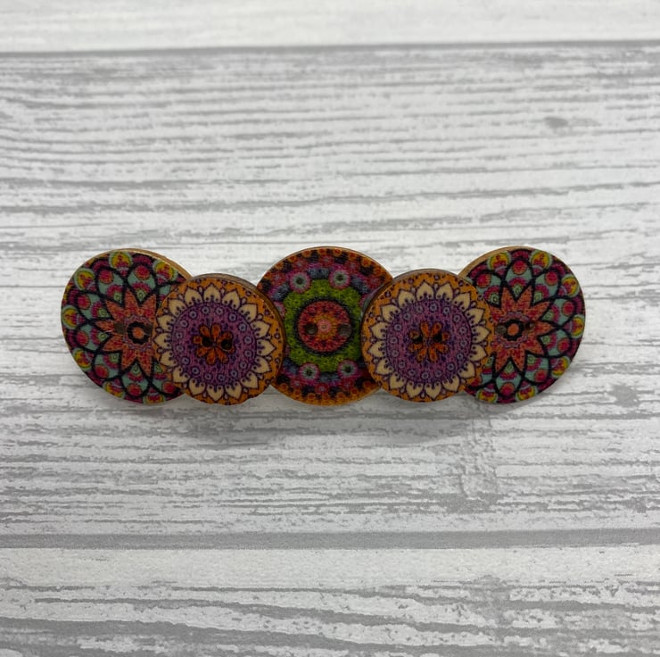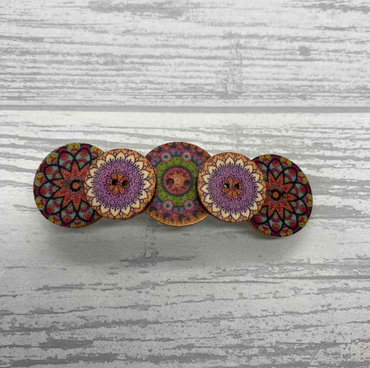 This barrette has five buttons with floral and mandala designs. There are three larger buttons on the bottom row, the buttons on the end are matching, with a different design on the centre button. Then there are two smaller matching buttons on the top row with a mandala design.