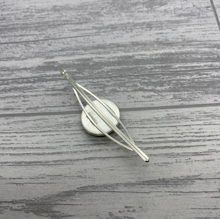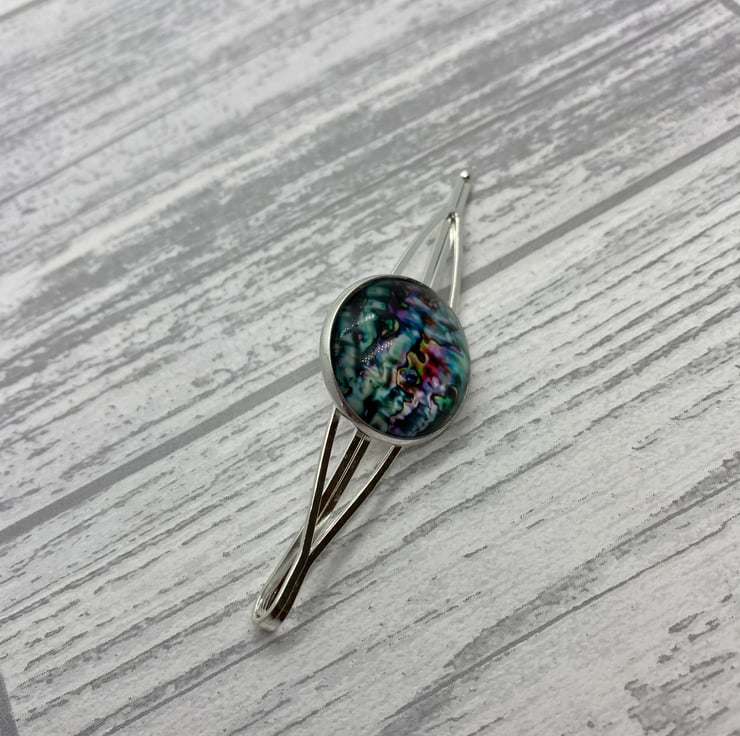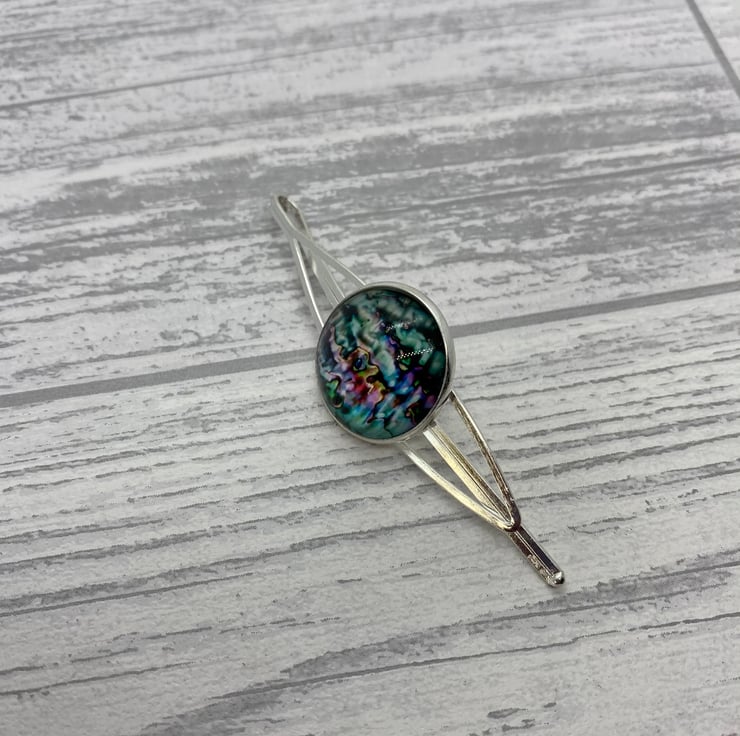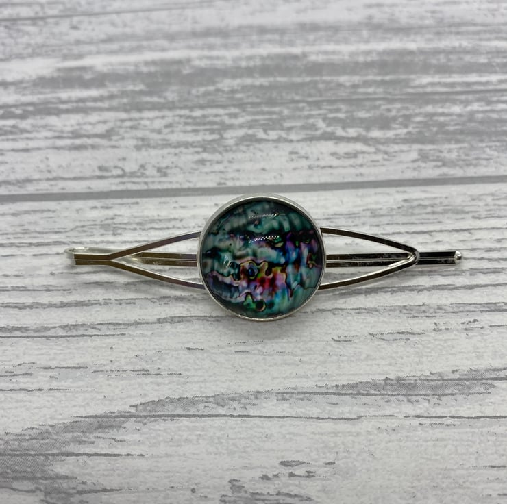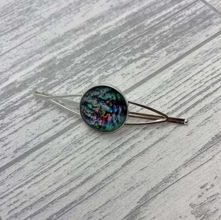 This is a beautiful hair clip / hair slide with an abstract print sealed under a glass dome, and set on a silver tone clip. The colour of the print is predominantly blue-green, and there are shades of pink, black and white. The print is reminiscent of Padua shell.