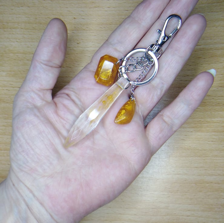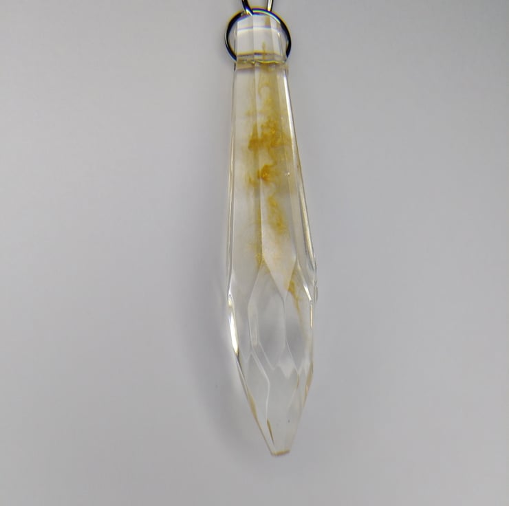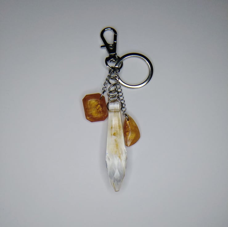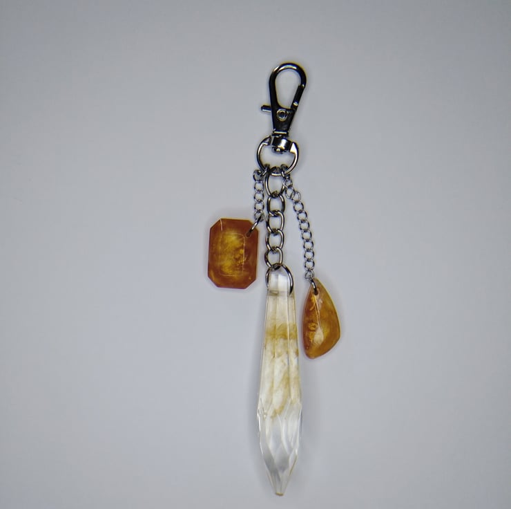 Elegant faux crystal bag charm with a lovely gold red swirl through the clear resin.