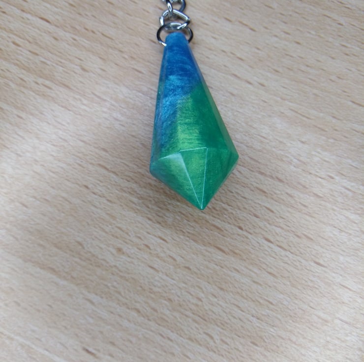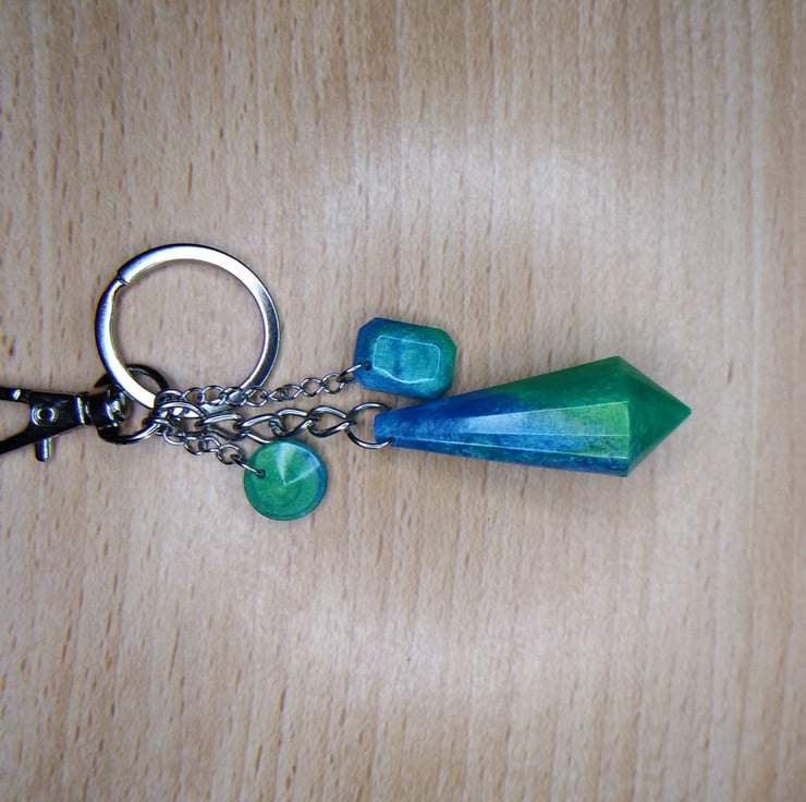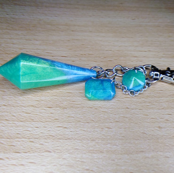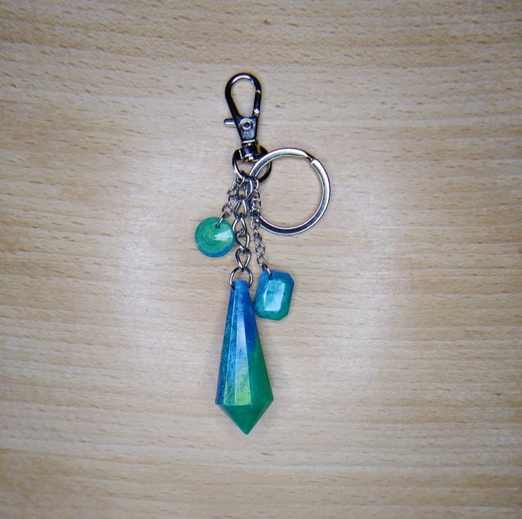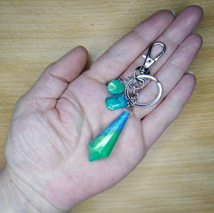 Lovely green and blue faux crystal bag charm with green and blue trinkets, made from resin.