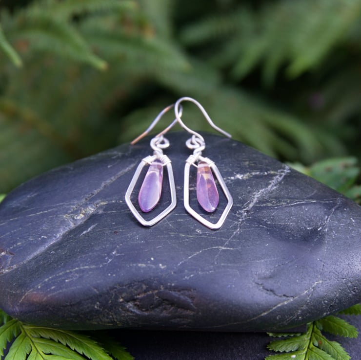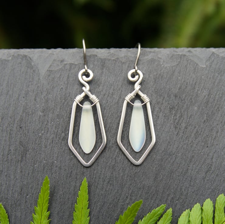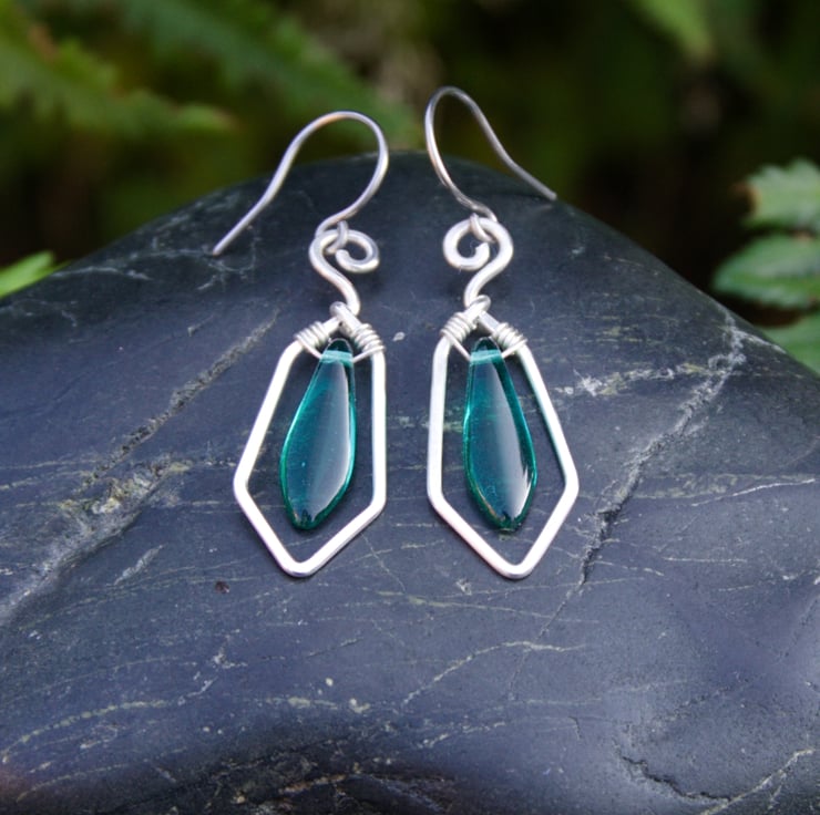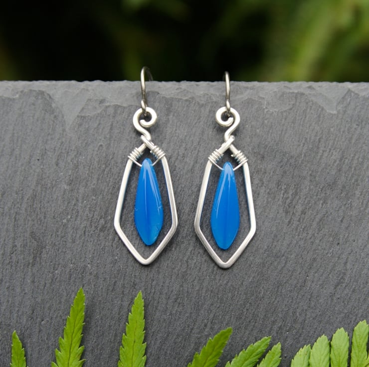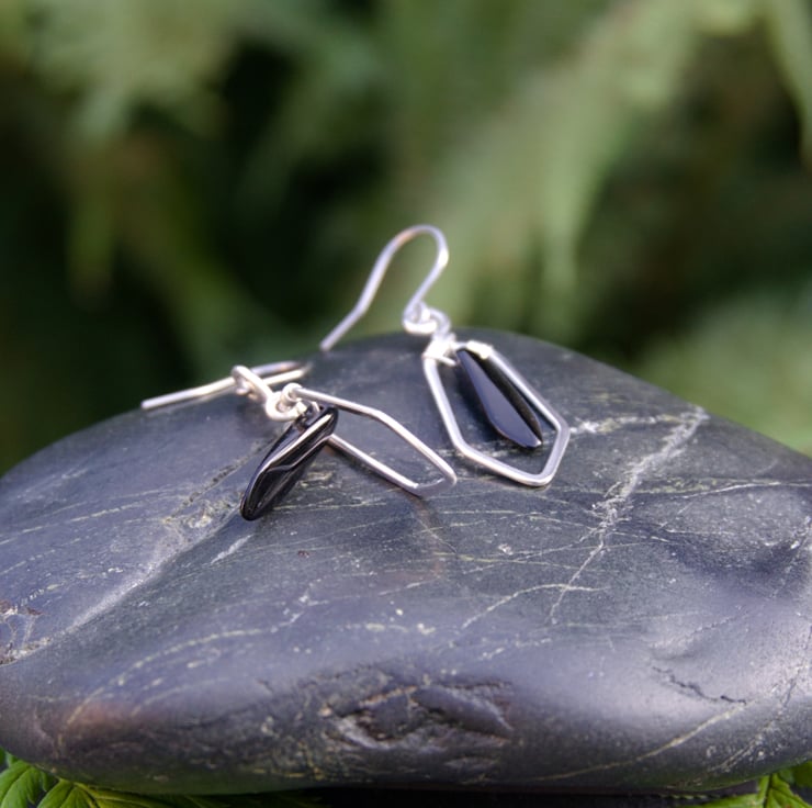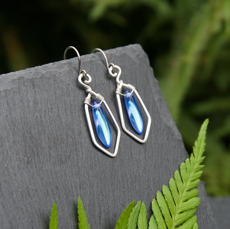 These striking geometric sterling silver earrings feature glass dagger beads in a range of colours. A single length of hammered silver wire forms the frame for each drop earring, mirroring the shape of the dagger bead. The bead is wrapped inside with fine wire - allowing it to hang and swing within the frame. These fabulous earrings are very eye catching and would make a wonderful gift (or treat for yourself!)