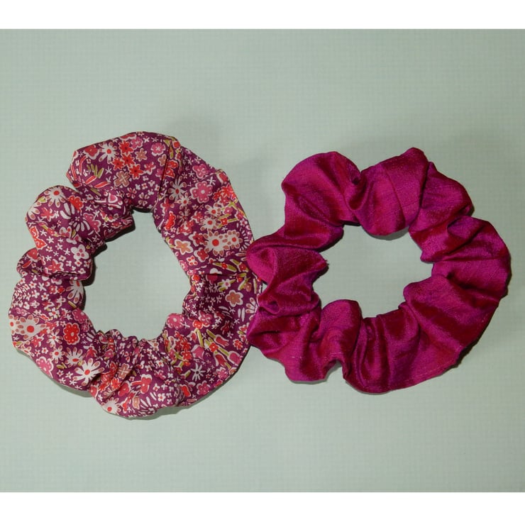These scrunchies bring a touch of luxury to any outfit or pampering session, one is a deep pink silk fabric and the other is a Liberty print fabric in a similar colour. The silk scrunchy shimmers in the light and both are soft and kind to your hair.