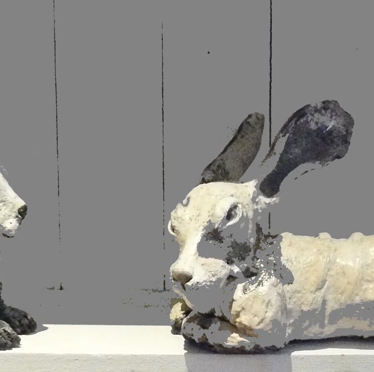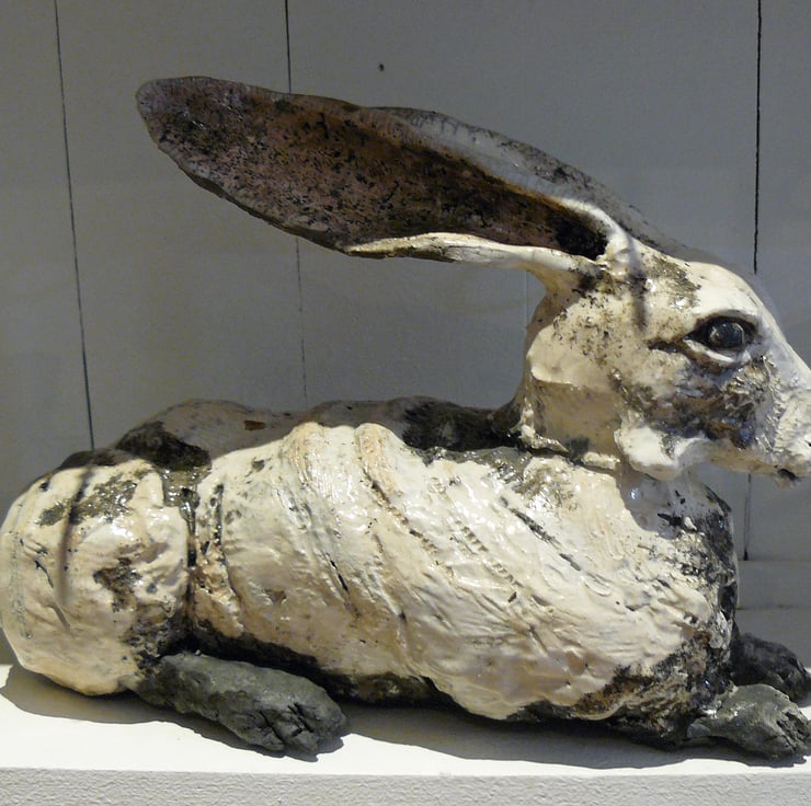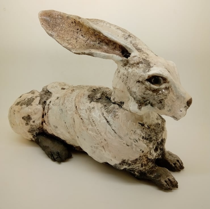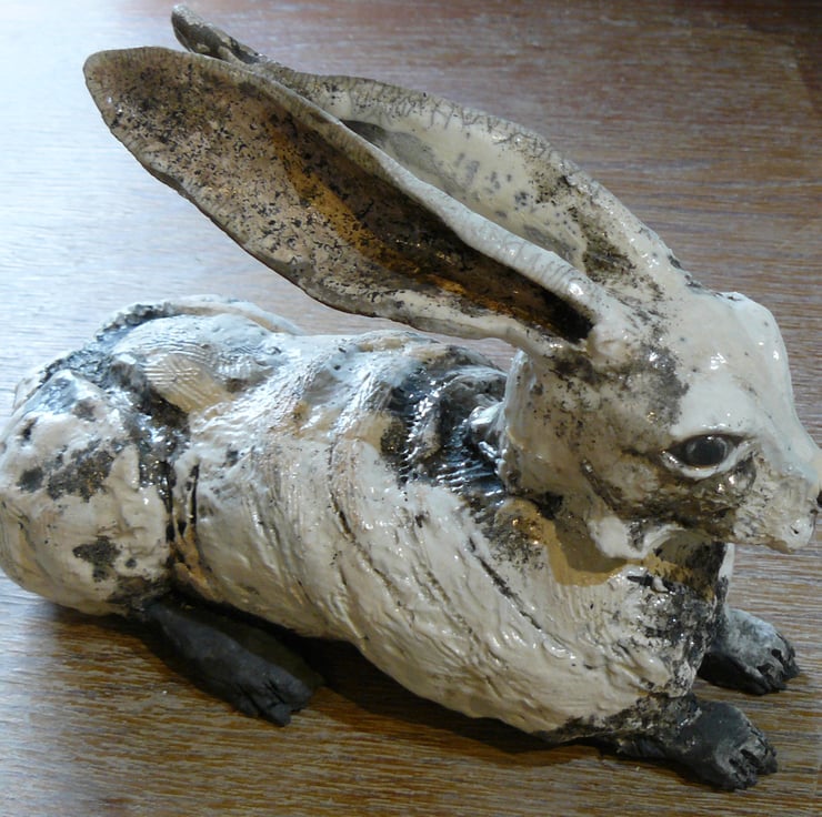 Coiled clay made into a large hare that has been fired in bisque kiln until 1000 degrees & then raku fired. Approx 28 x 16 cms. Made over 3 days. The body was formed first, packed with newspaper & later head made. Newspaper withdrawn & assembled & next day legs formed & added. Can sit outside in summer, but on mantlepiece or hearth in winter as may get frost damage if not protected.