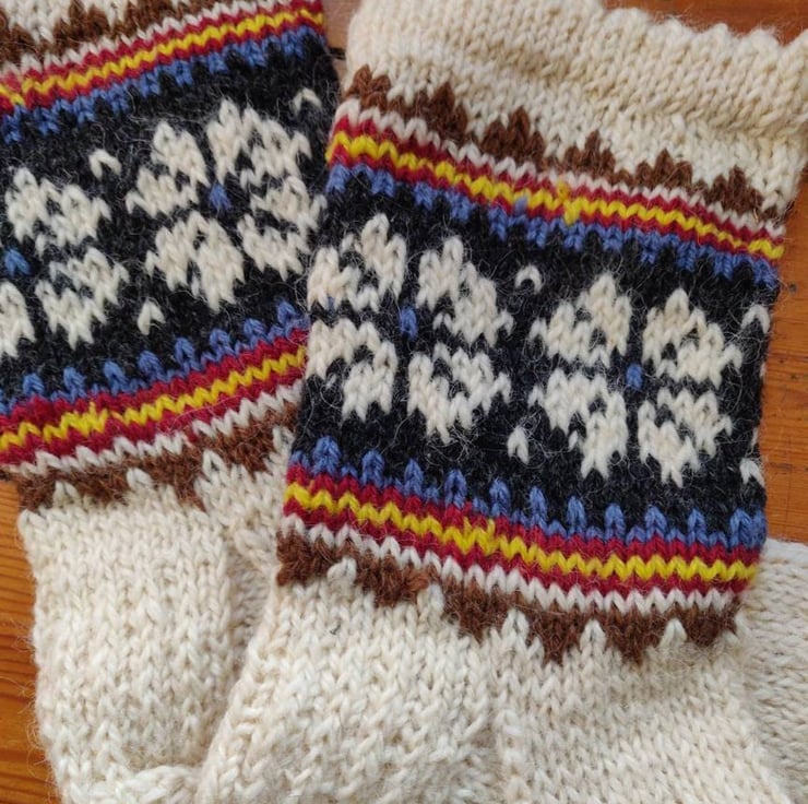 Hand made thick wool socks in off white with traditional fairisle pattern in black, blue, brown, yellow and maroon.