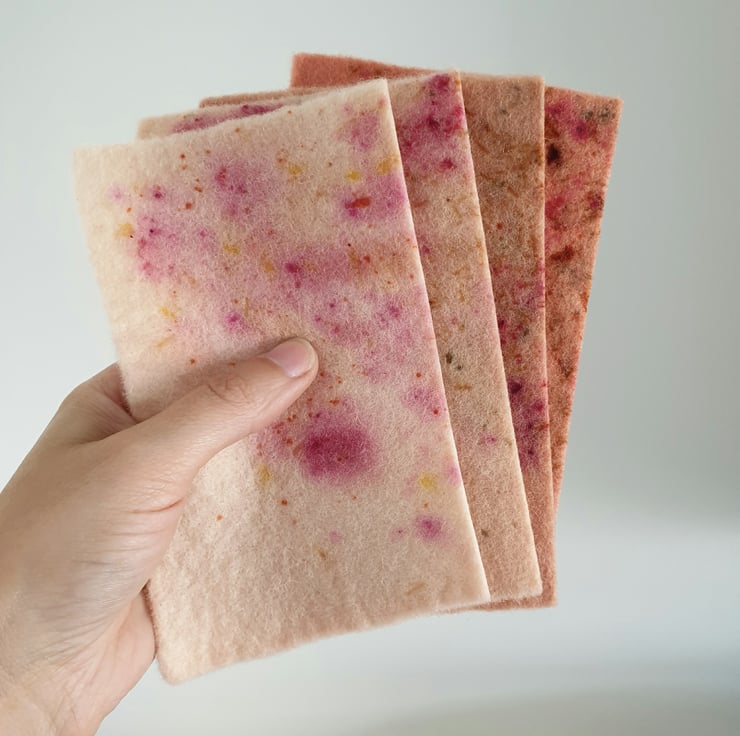 100% wool felt sheets naturally dyed in using madder, an ancient red dye from a root, in a gradient of four shades. The speckles fade from one end of each sheet to the other in colours that vary, yet complement each other.