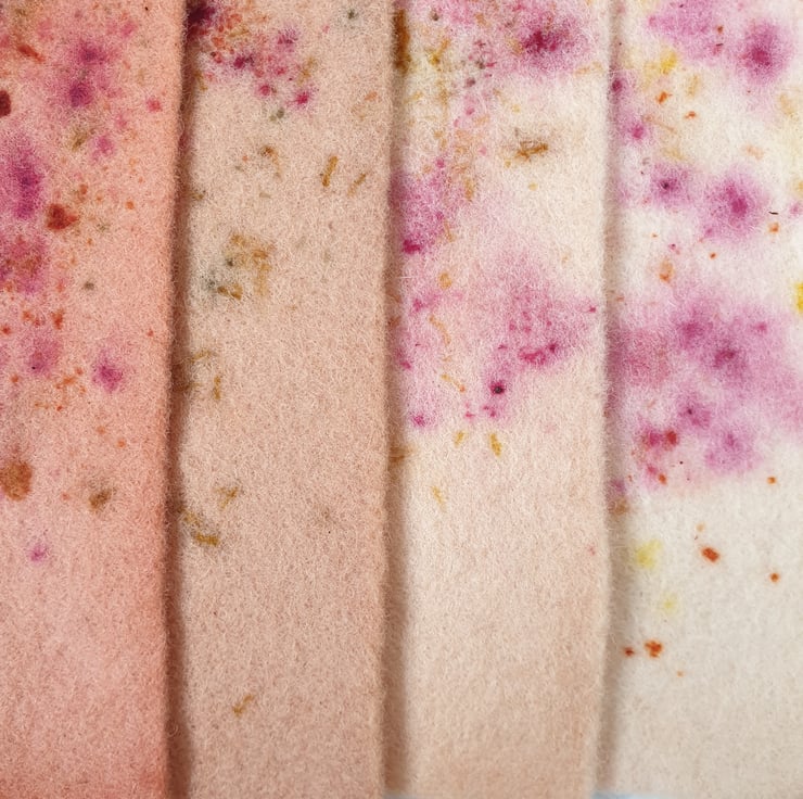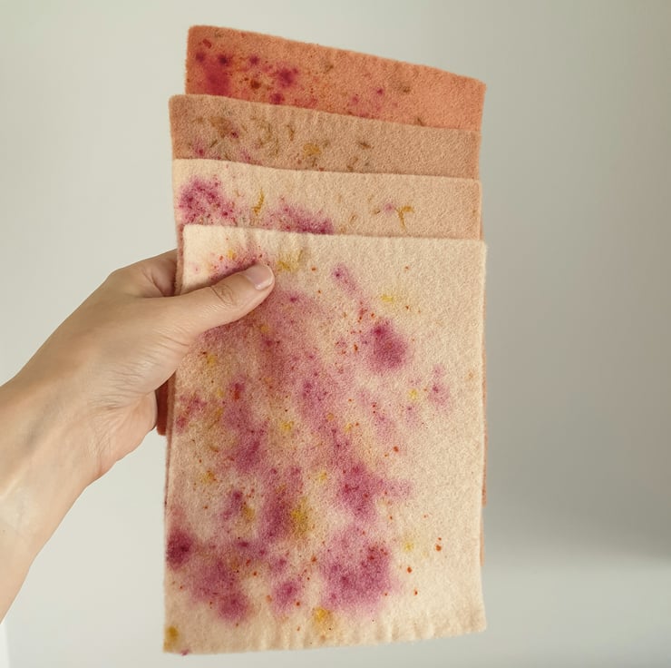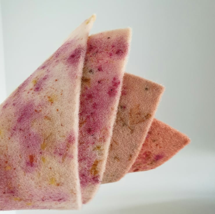 100% wool felt sheets naturally dyed in using madder, an ancient red dye from a root, in a gradient of four shades. The speckles fade from one end of each sheet to the other in colours that vary, yet complement each other.