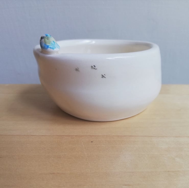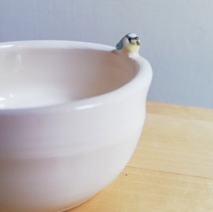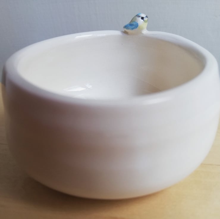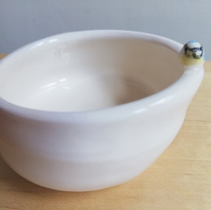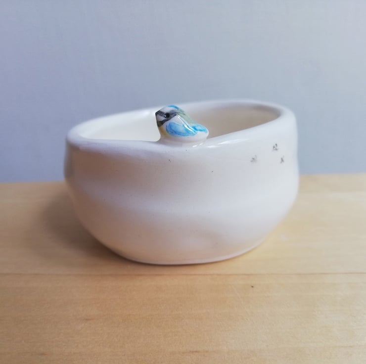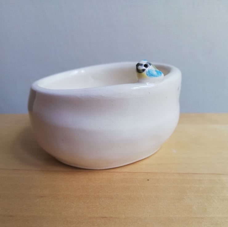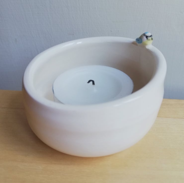 Hand thrown little tealight pot. The tiniest of handmade blue tits was attached prior to bisque firing along with bird prints . The bird was then hand painted and the whole pot dipped in clear lead free glaze prior to the final firing