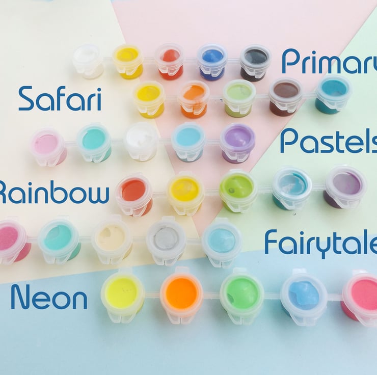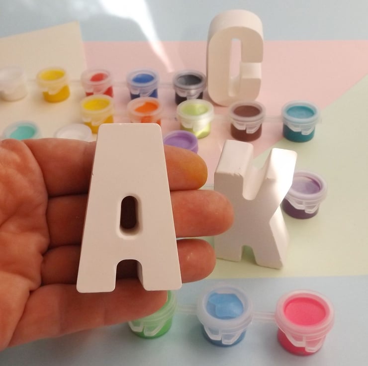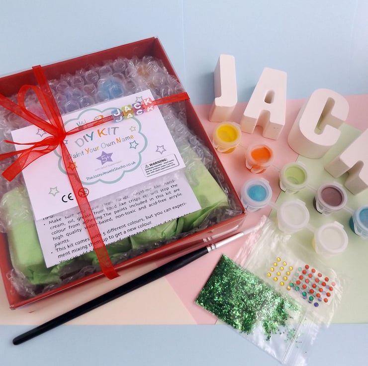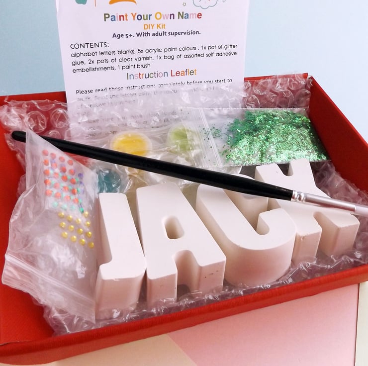 Each name painting kit comes with your chosen alphabet letters, a set of 5 assorted paint pots (choose between five colour palettes), glitter glue, clear vanish, paint brush and one bag of assorted embellishments.