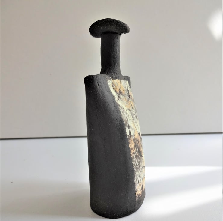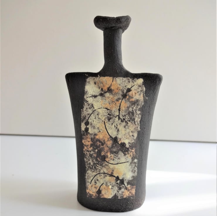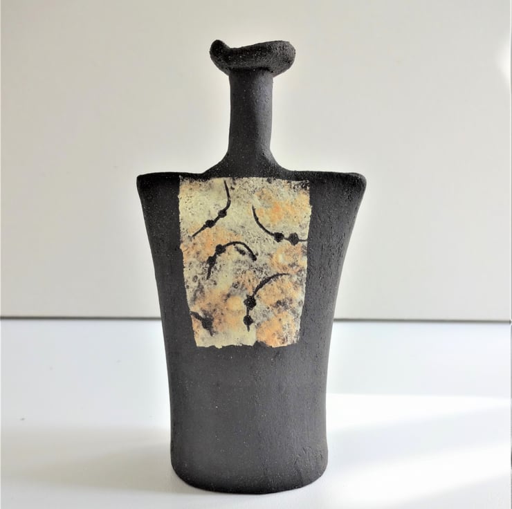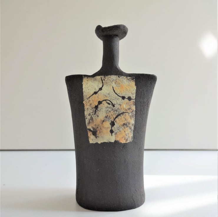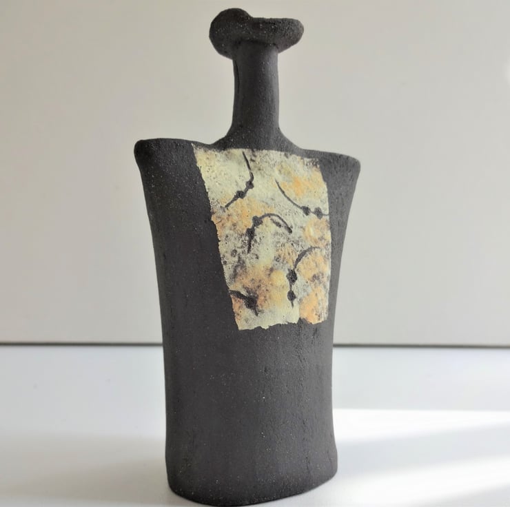 Abstract panels of mingling lemon yellow and orange yellow form a tabard effect on this small ceramic art form. I manipulate soft clay in my hands to make the hollow form, then use coloured slips (liquid clay) applied with a natural sponge to create the decoration on the front and back. One side has a panel covering the full length of the piece, the other has a panel half the height of the form - see images. When the slip has dried, I incised curved lines and dots to reveal the matt black stoneware clay beneath. After two firings in my kiln the result is Jasper, the latest addition to the Kindred Collection. Jasper is an intriguing art piece alone, or can form a ‘family group’ with other pieces from the collection. Kindred pieces also form a quiet focal point for meditative practices such as yoga or mindfulness. 11.5 cms high.