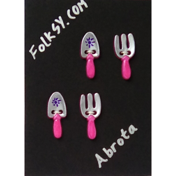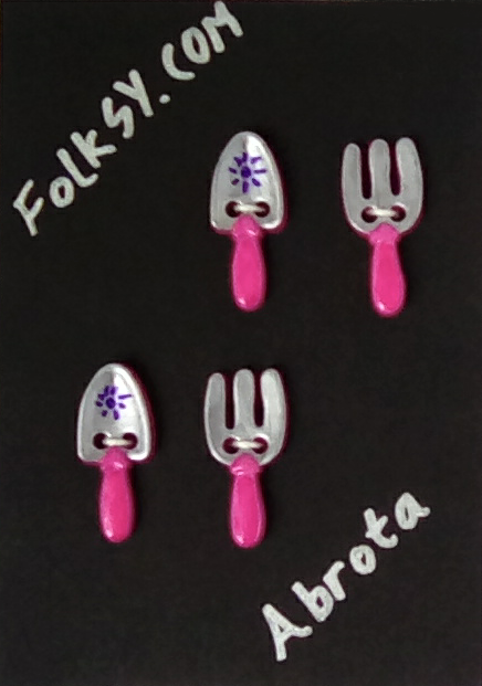 2 fork and 2 trowel decorative buttons in pink and silver that can be used to brighten a kid's outfit or to use in craft projects. They come attached to a piece of card.