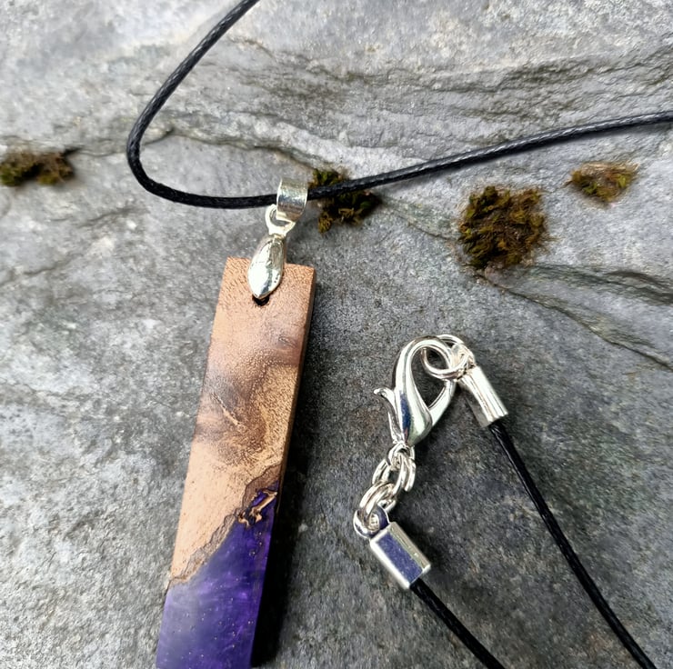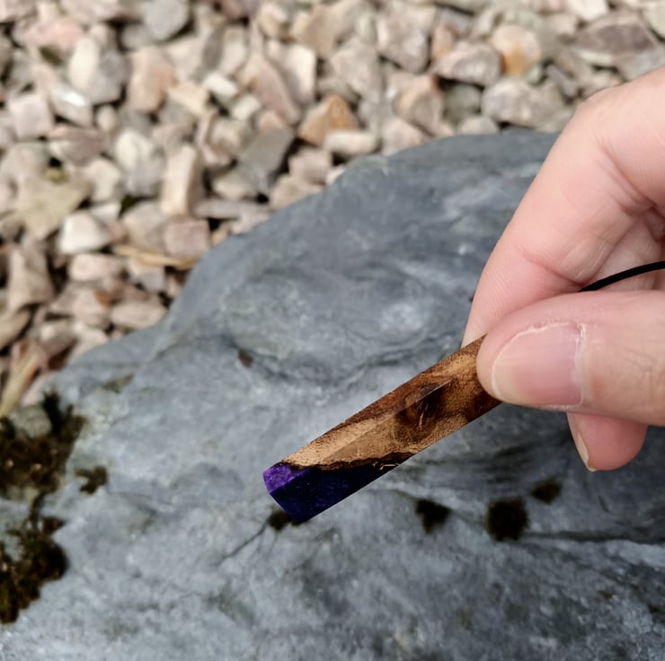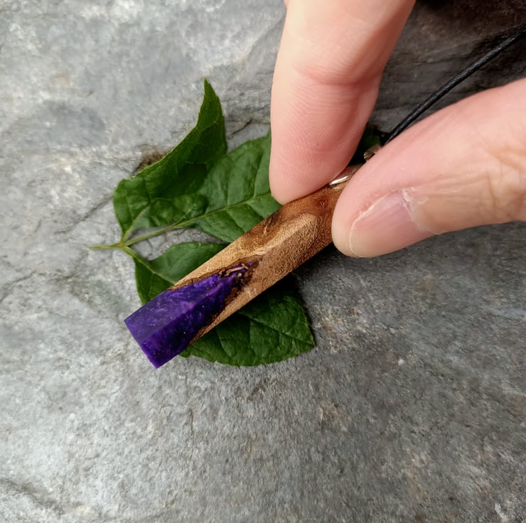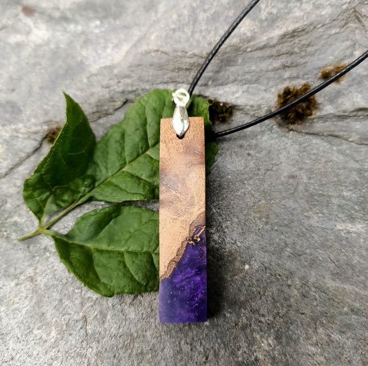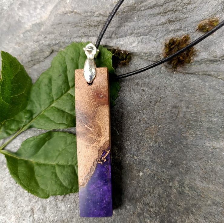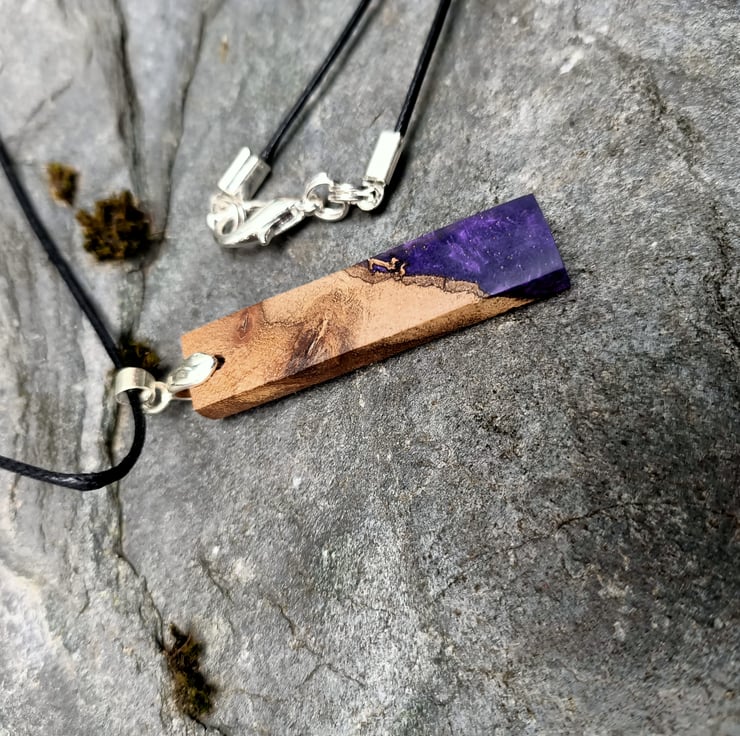 Elm wood and purple resin pendant necklace. This handmade wooden pendant has been lovingly made from beautiful Elm burr wood and our own mix purple resin. The purple resin follows its own pattern through the wood making it a totally one of a kind piece. We hope you love this style as much as we do!