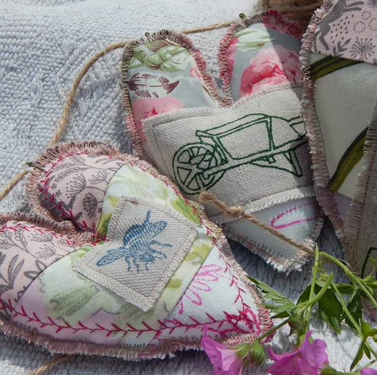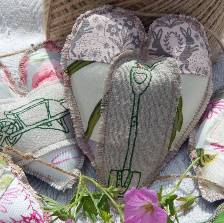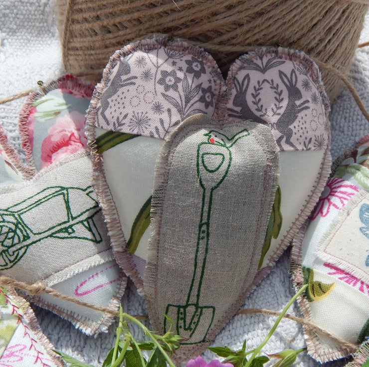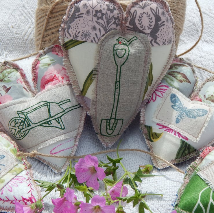 There are 5 hearts measuring approximately 11cm by 9cm at the widest/longest point. They are made of double sided patchwork with appliqued bee and moth and screen printed, wheelbarrow, watering can and robin on a spade. The central heart is just slightly larger than the other 4.