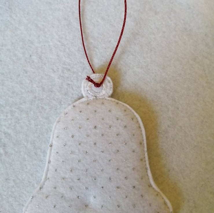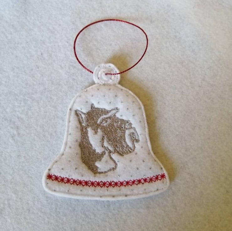 Schnauzer bell Christmas tree hanging ornament made from white sparkle felt.