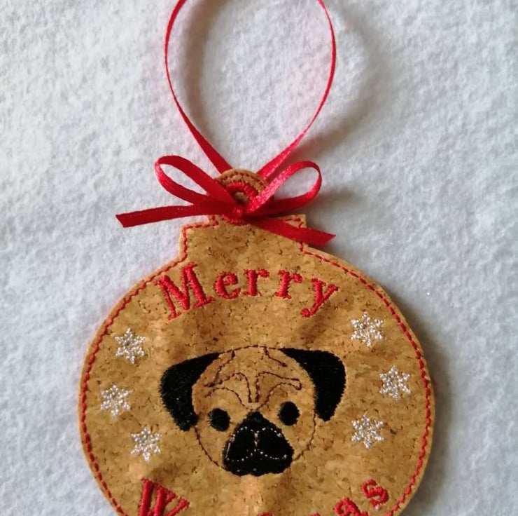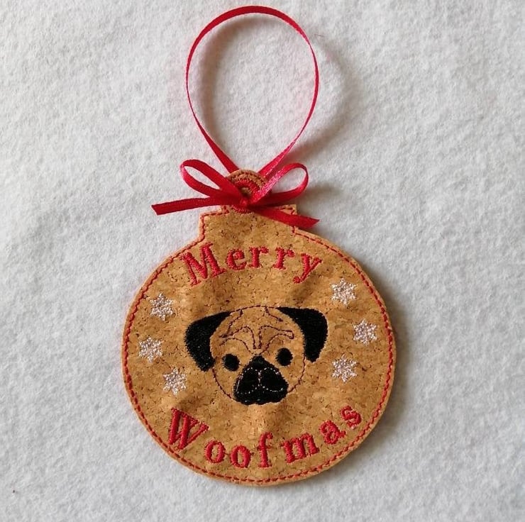 Merry Woofmas - Pug Christmas tree hanging ornament made from cork fabric and backed with felt.