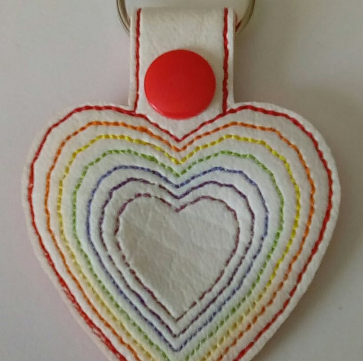 7 colour lines rainbow heart keyring made from vinyl and backed with felt.