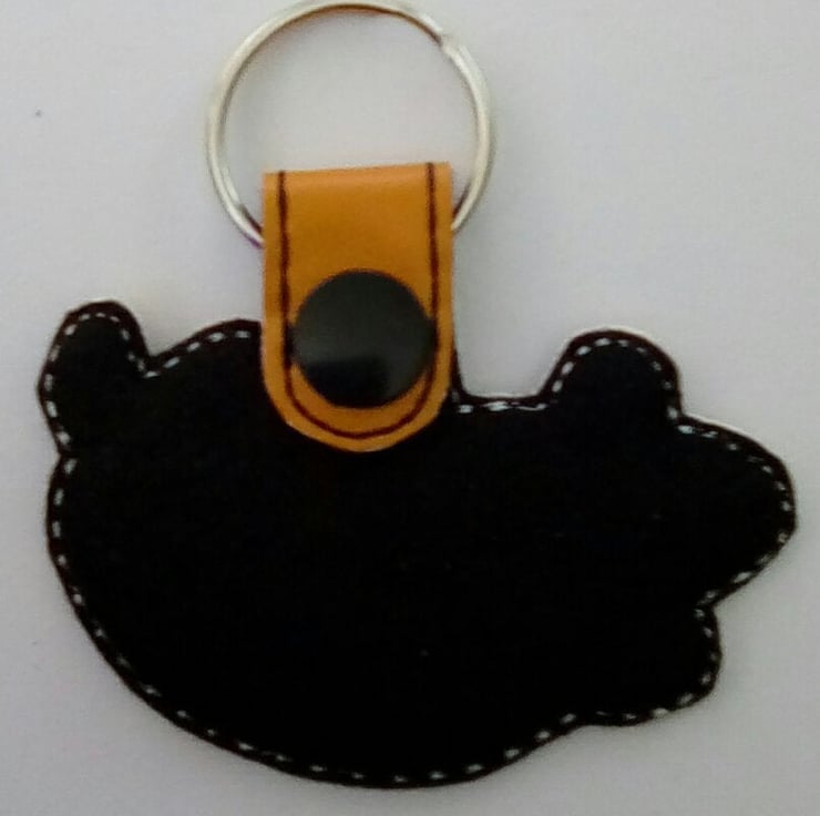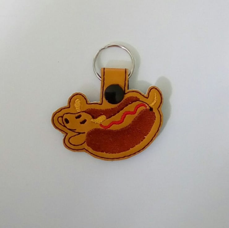 Hot doggo keyring made from vinyl and backed with felt.