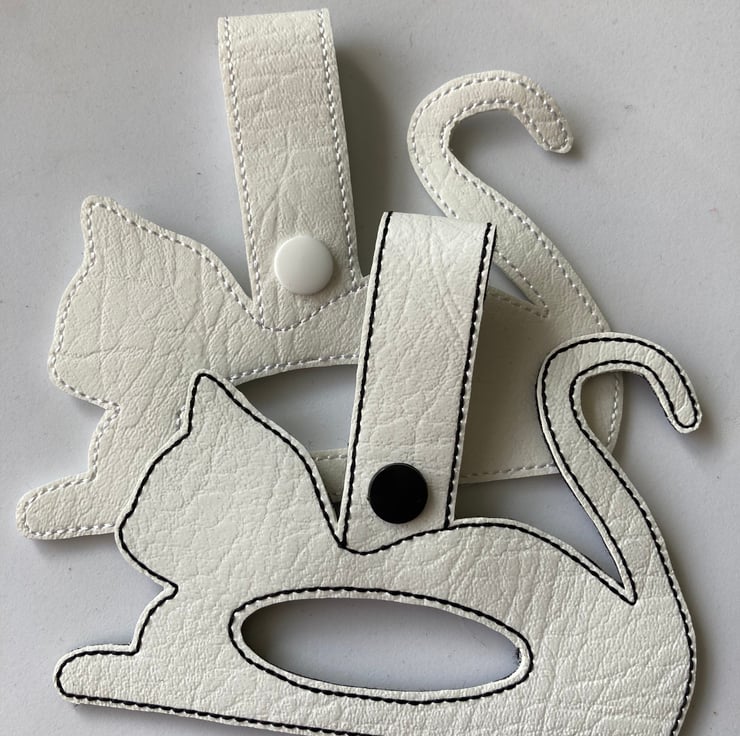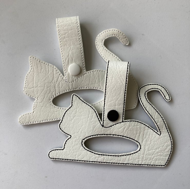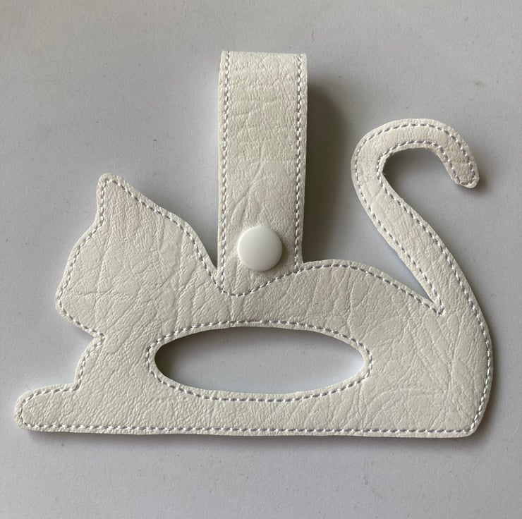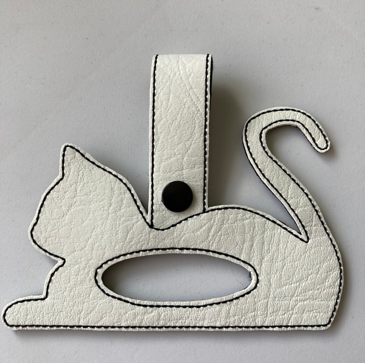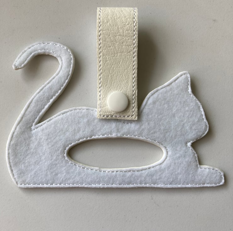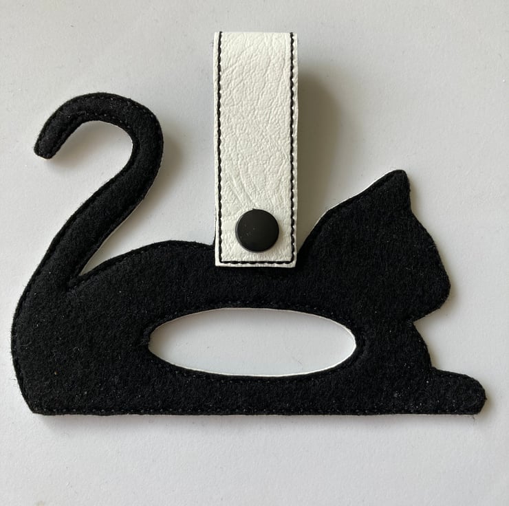Laying cat tea towel holder made from vinyl and backed with felt.