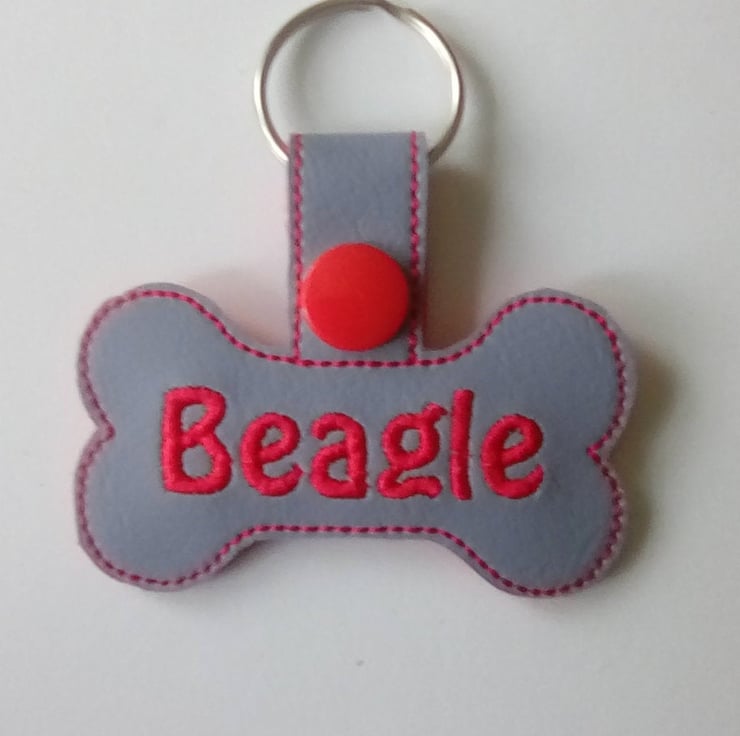 Beagle bone shaped keyring made from vinyl and backed with felt.